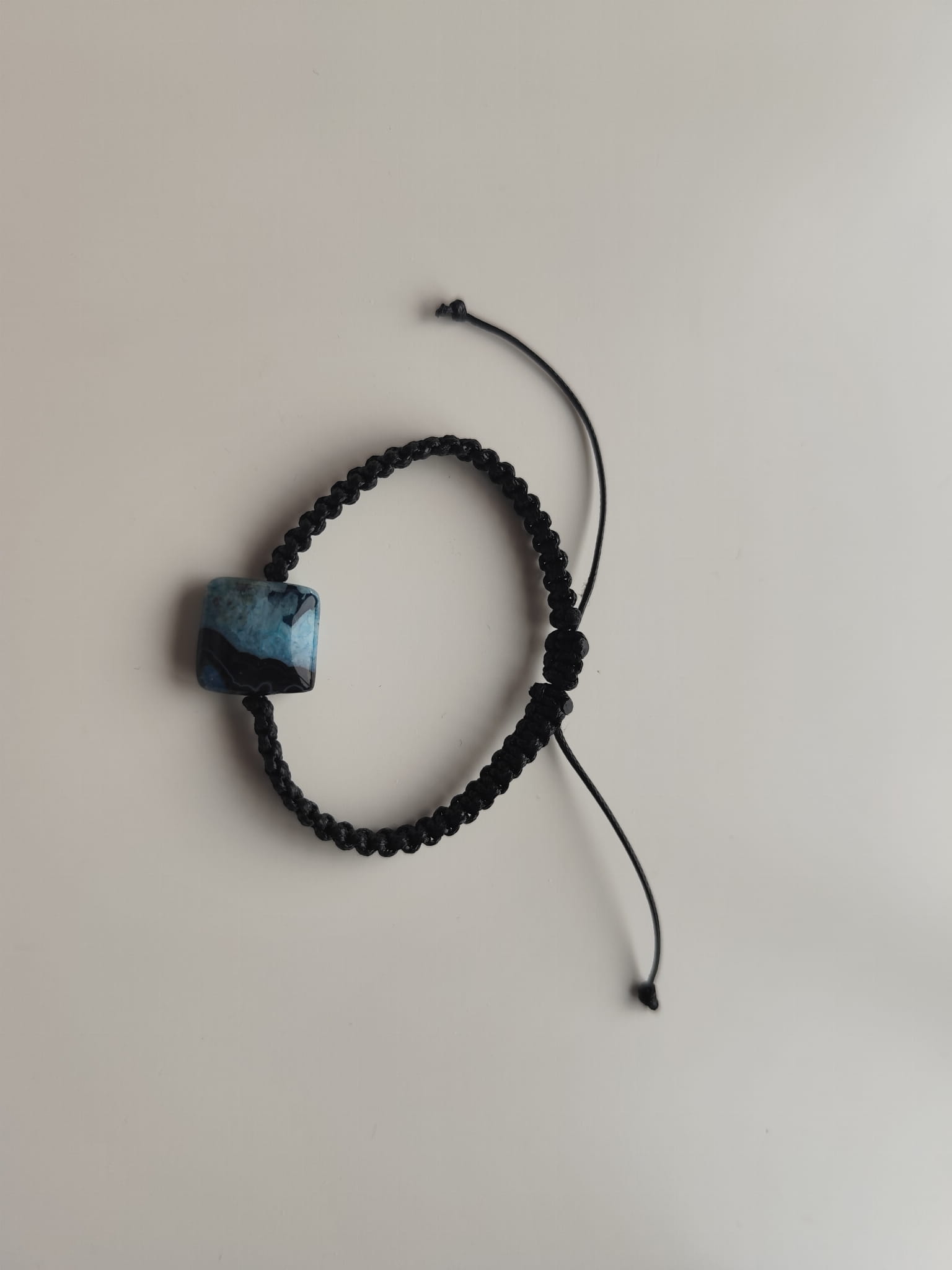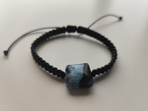 Bransoletka z kamieniem agatu w odcieniach czerni i błękitu na czarnym sznurku