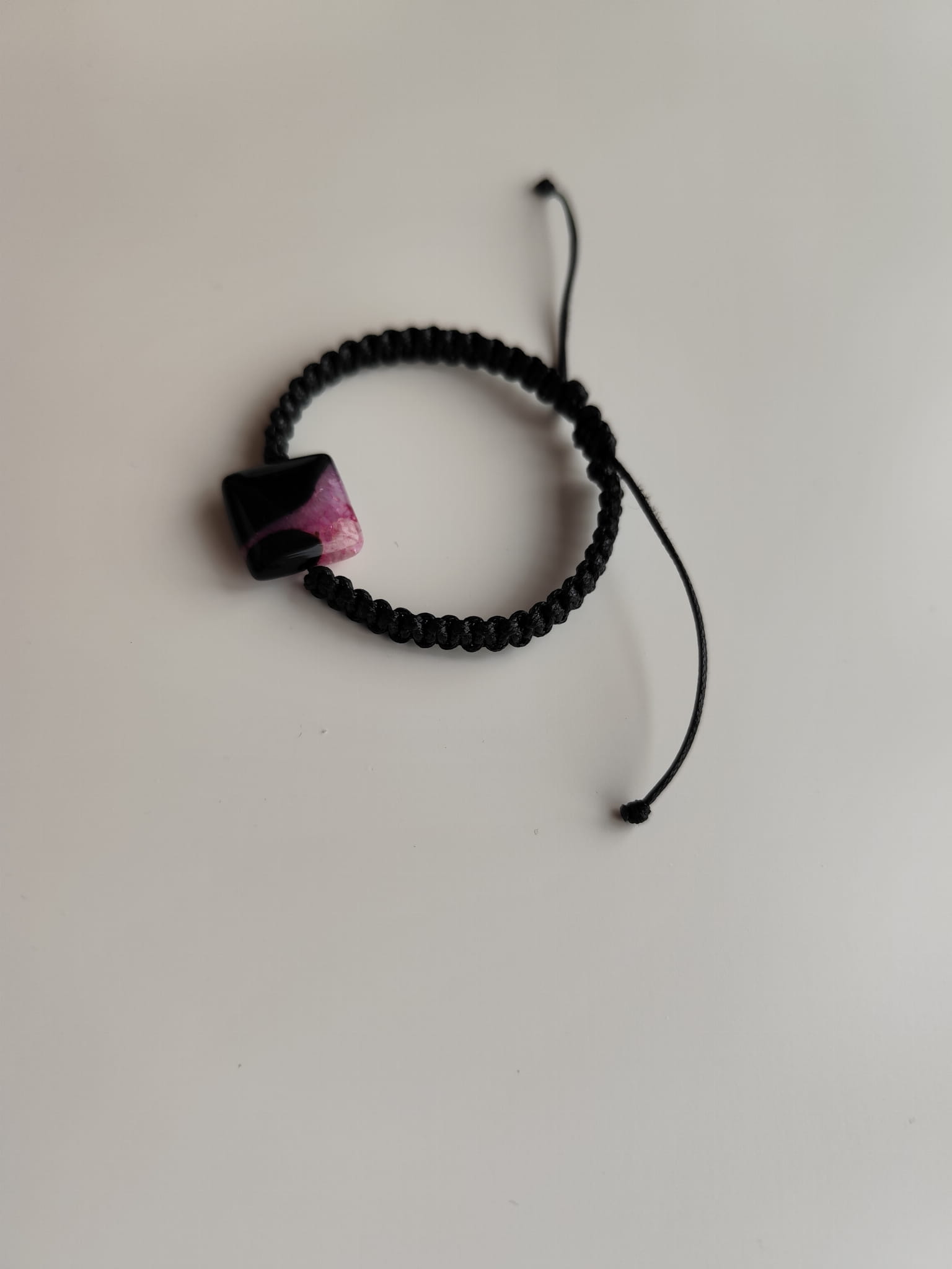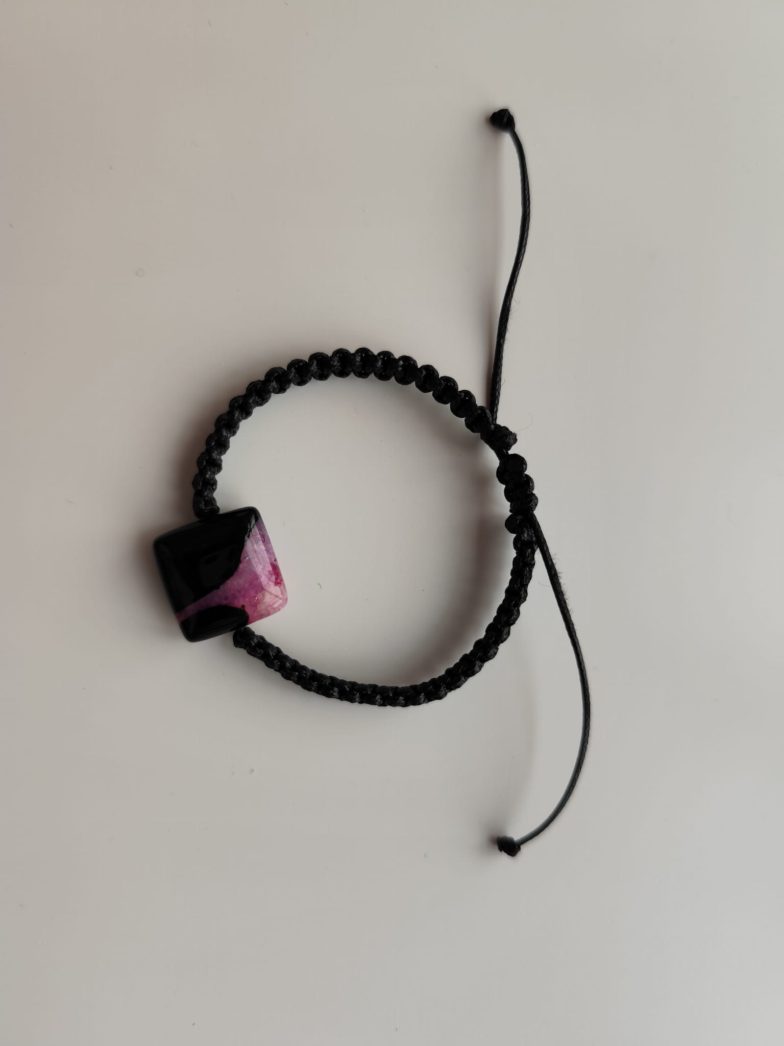 Bransoletka z kamieniem agatu w odcieniach czerni i różu na czarnym sznurku