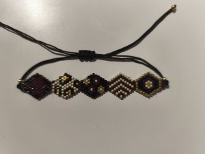 Bransoletka z koralików MIYUKI w kolorach czerni, bieli, brązu i złota na czarnym sznurku