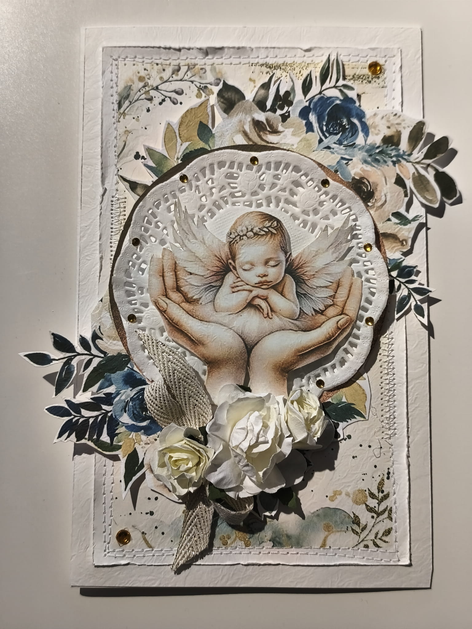 Kartka została wykonana z wysokiej jakości papierów ozdobnych i dekoracyjnych elementów.