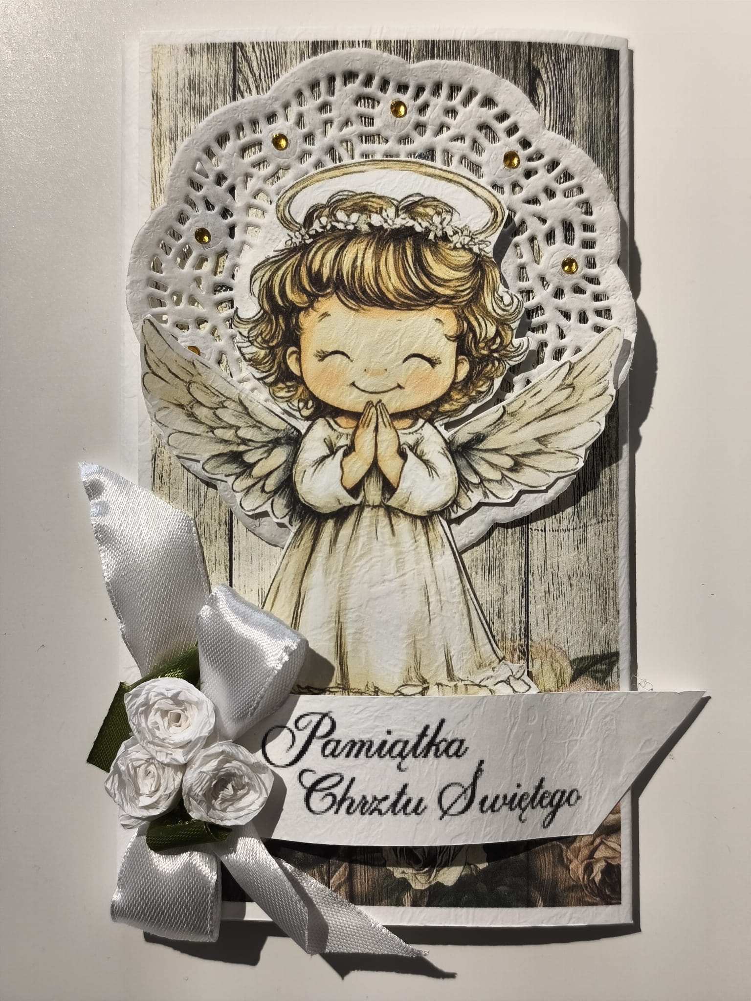 Delikatna i elegancka kartka wykonana ręcznie z dbałością o każdy szczegół. Utrzymana w jasnej kolorystyce, ozdobiona subtelnymi elementami dekoracyjnymi, które podkreślają wyjątkowy charakter uroczystości Chrztu Świętego.
