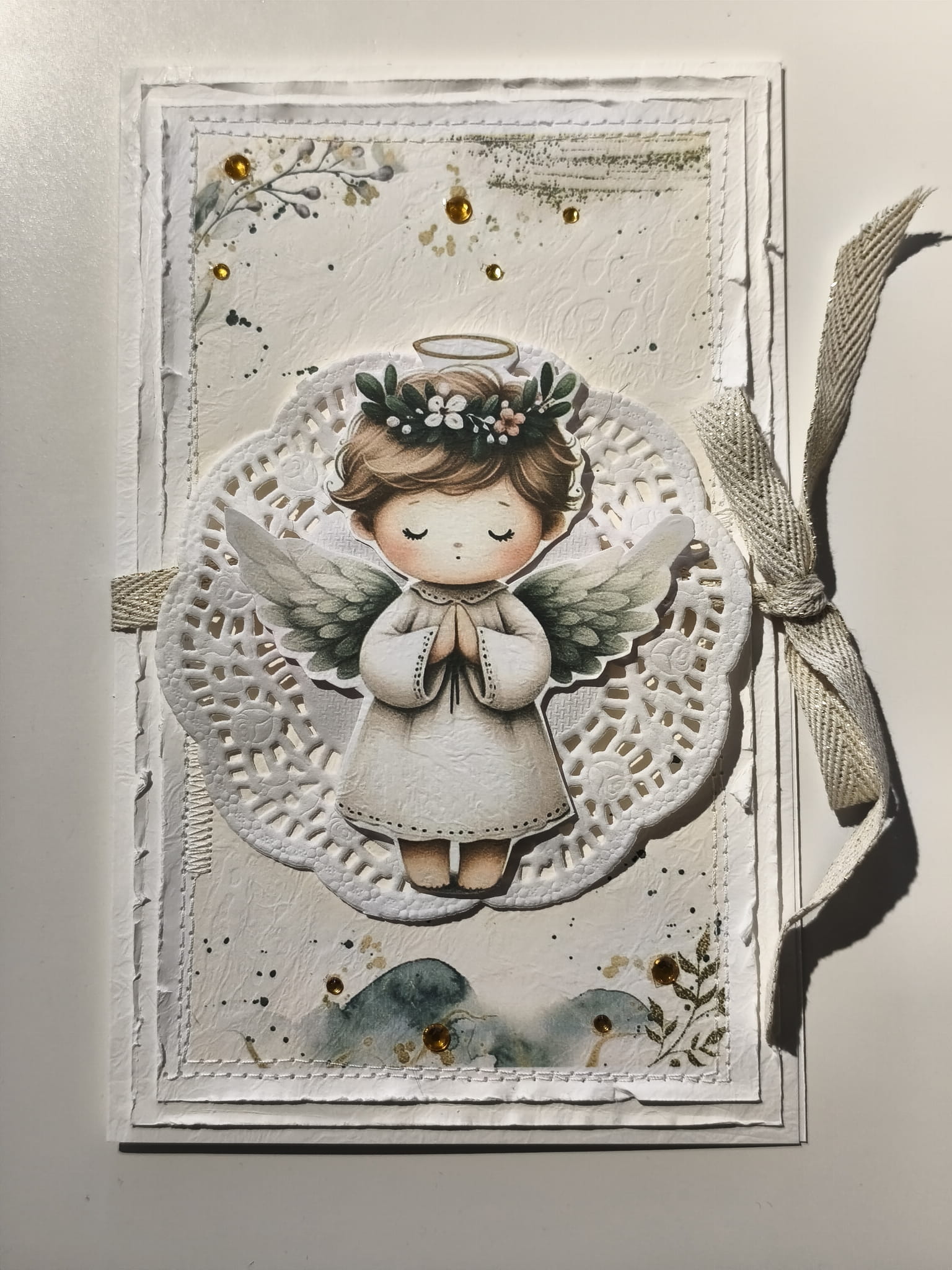 Kartka została wykonana z wysokiej jakości papierów ozdobnych i dekoracyjnych elementów.