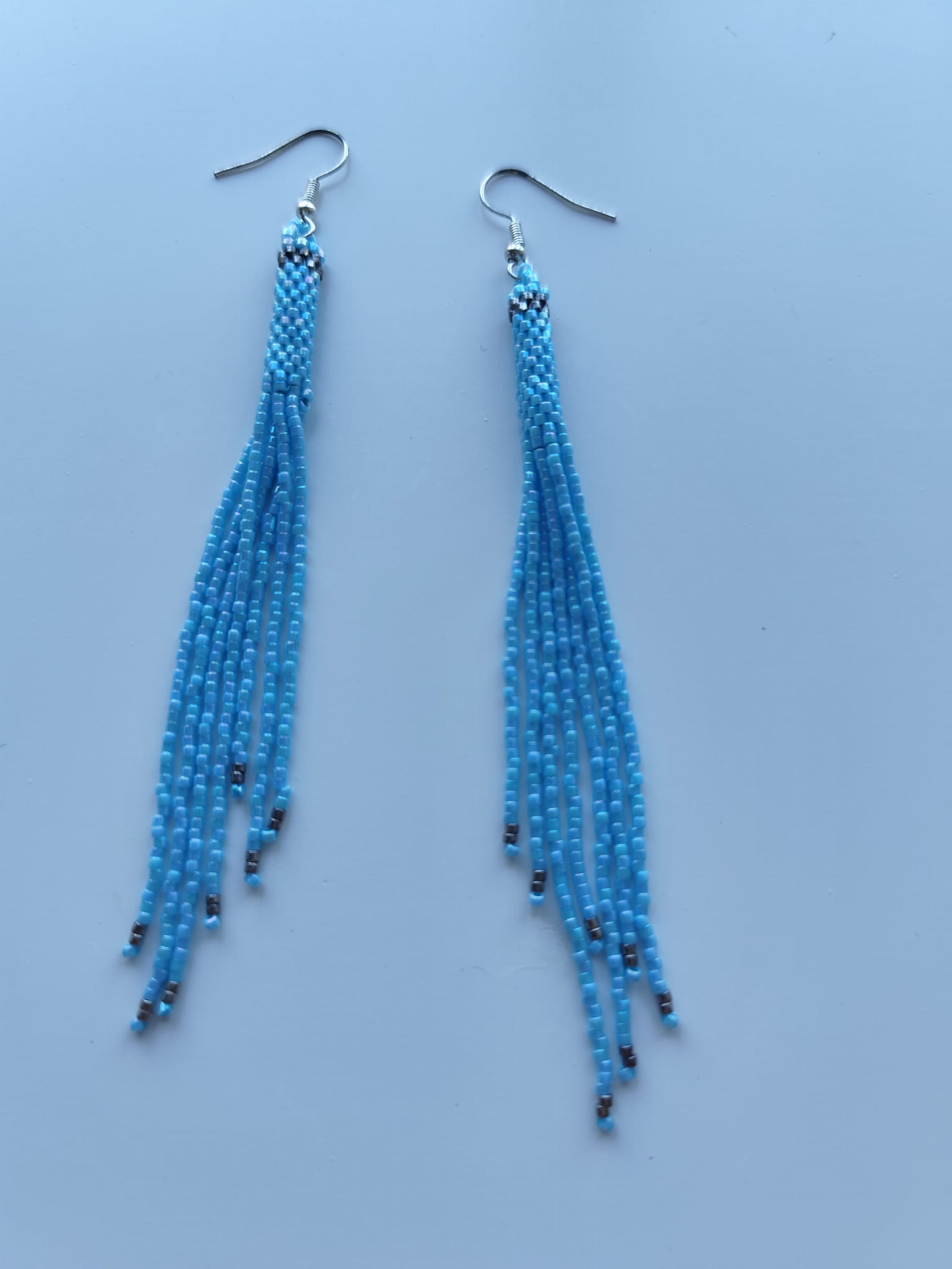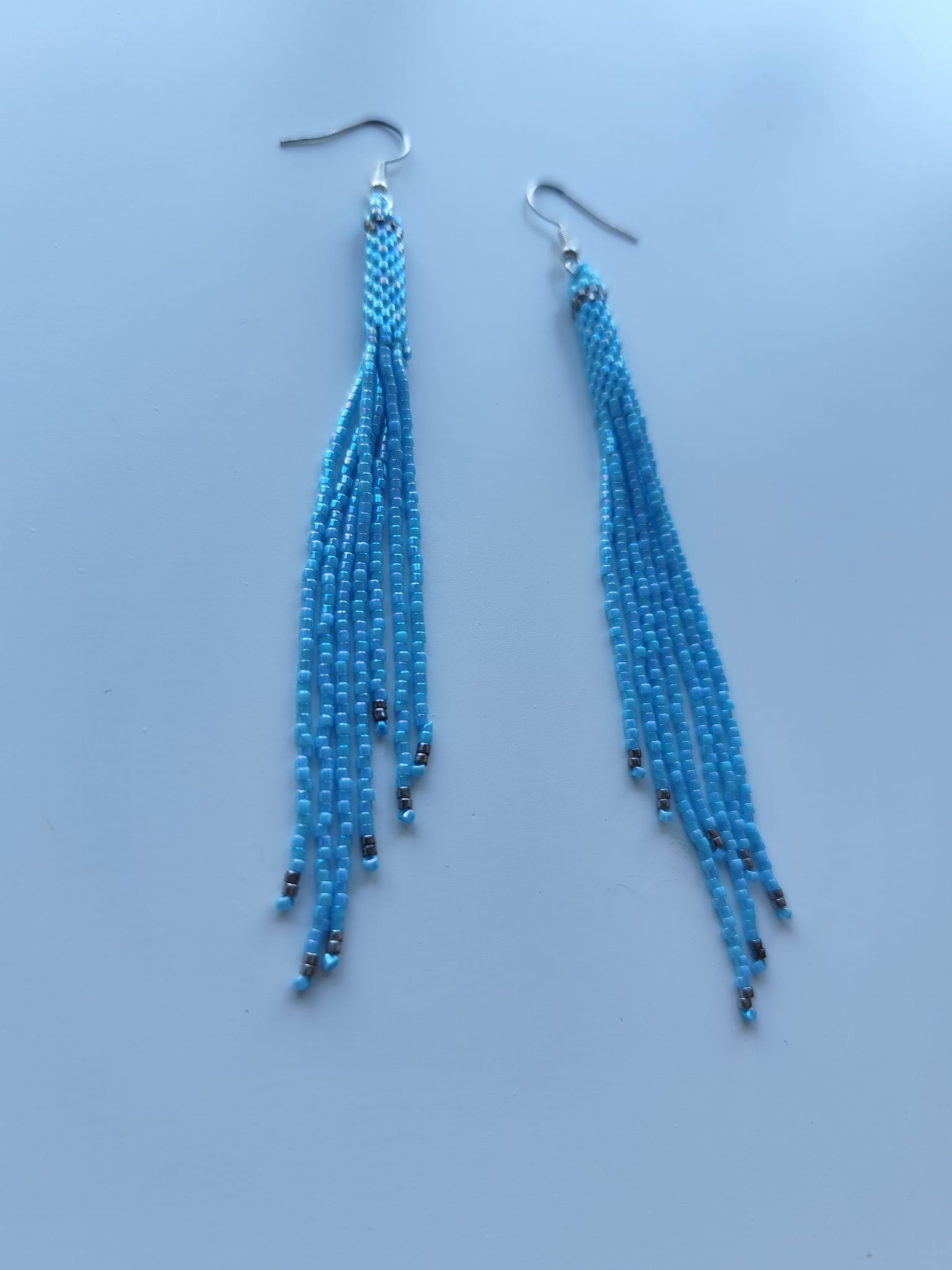 Eleganckie i subtelne kolczyki wykonane ręcznie z drobnych, wysokiej jakości koralików Miyuki w odcieniu delikatnego błękitu z połyskującymi srebrnymi akcentami. Ich lekka forma i harmonijne połączenie kolorów tworzy wrażenie świeżości i klasy, idealne zarówno na co dzień, jak i na wyjątkowe okazje. To biżuteria, która doda blasku każdej stylizacji, nie przytłaczając jej.