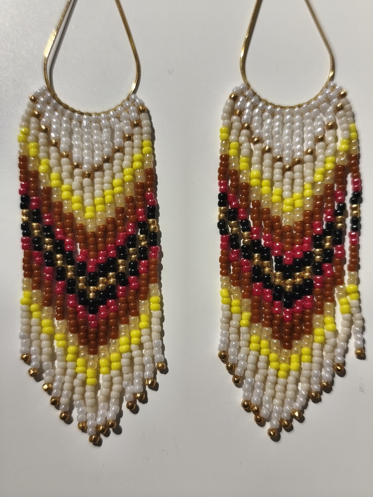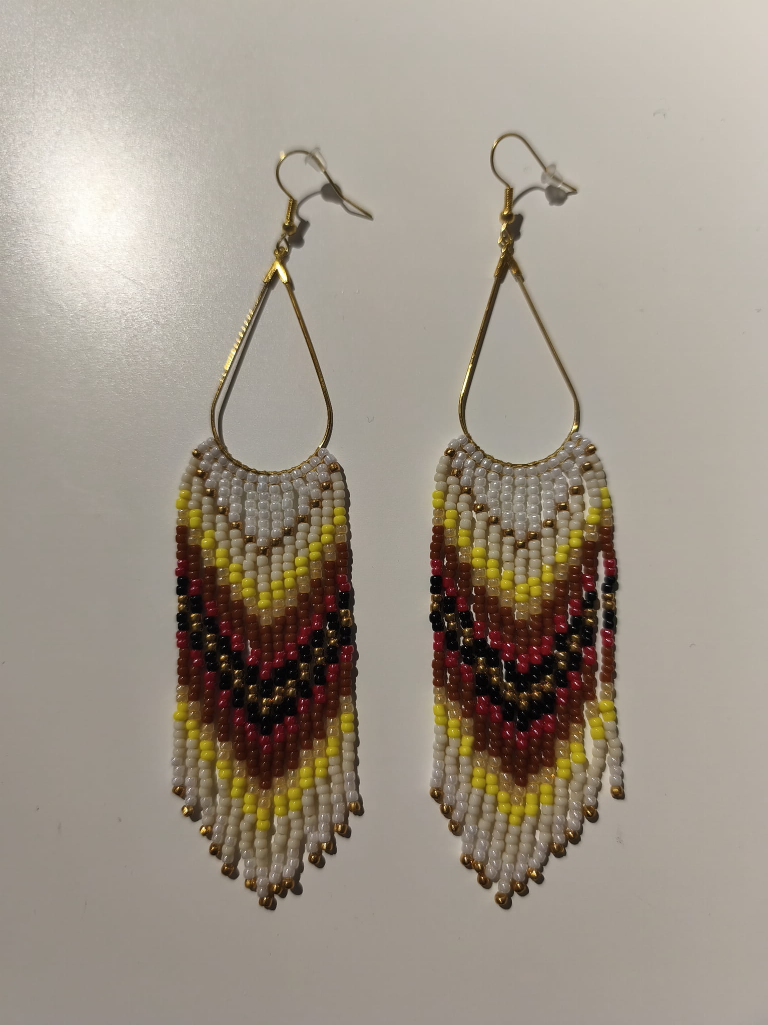 Kolczyki z koralików TOHO w kolorach bieli i czerwieni z żółtymi, złotymi i czarnymi akcentami