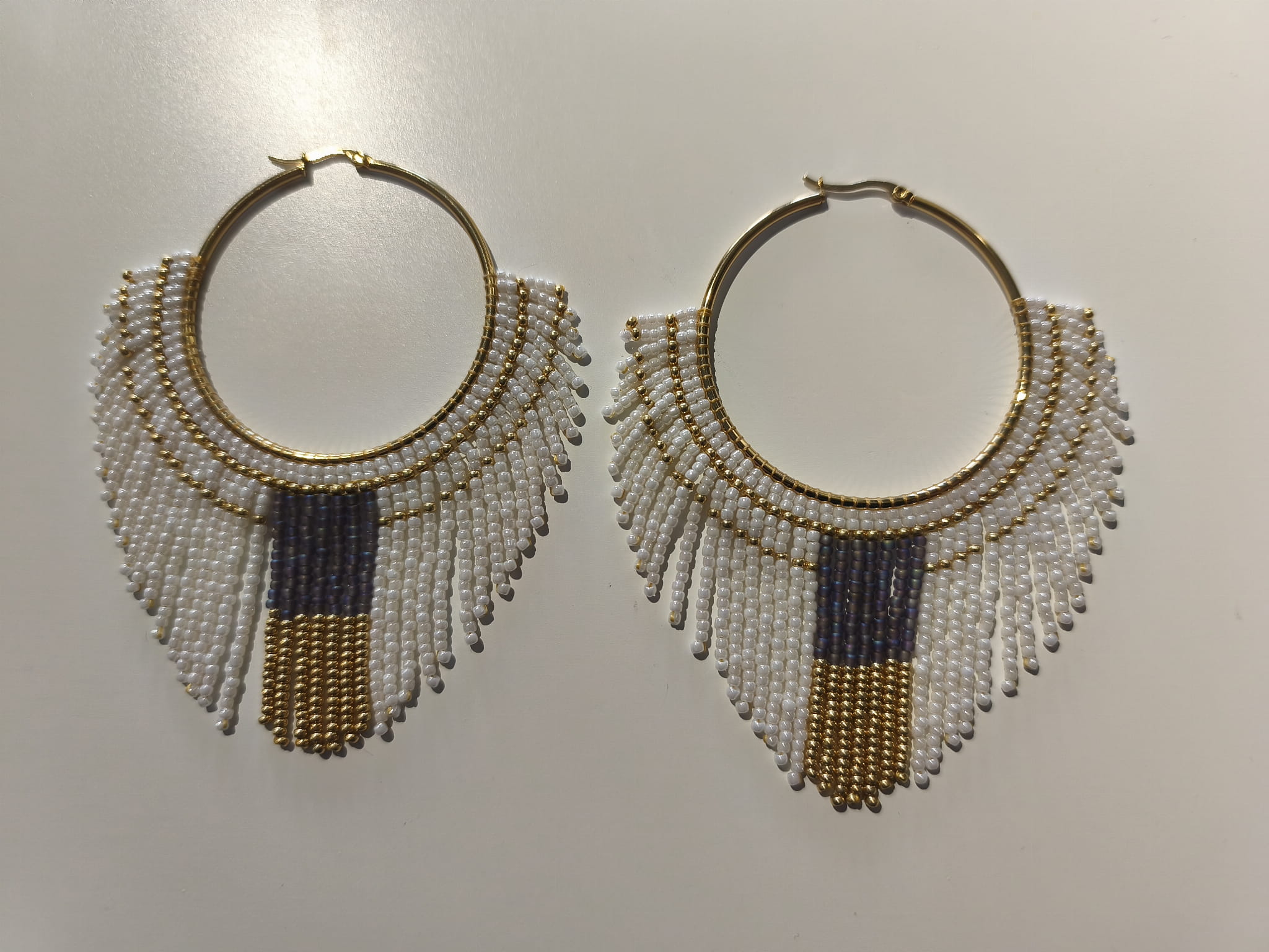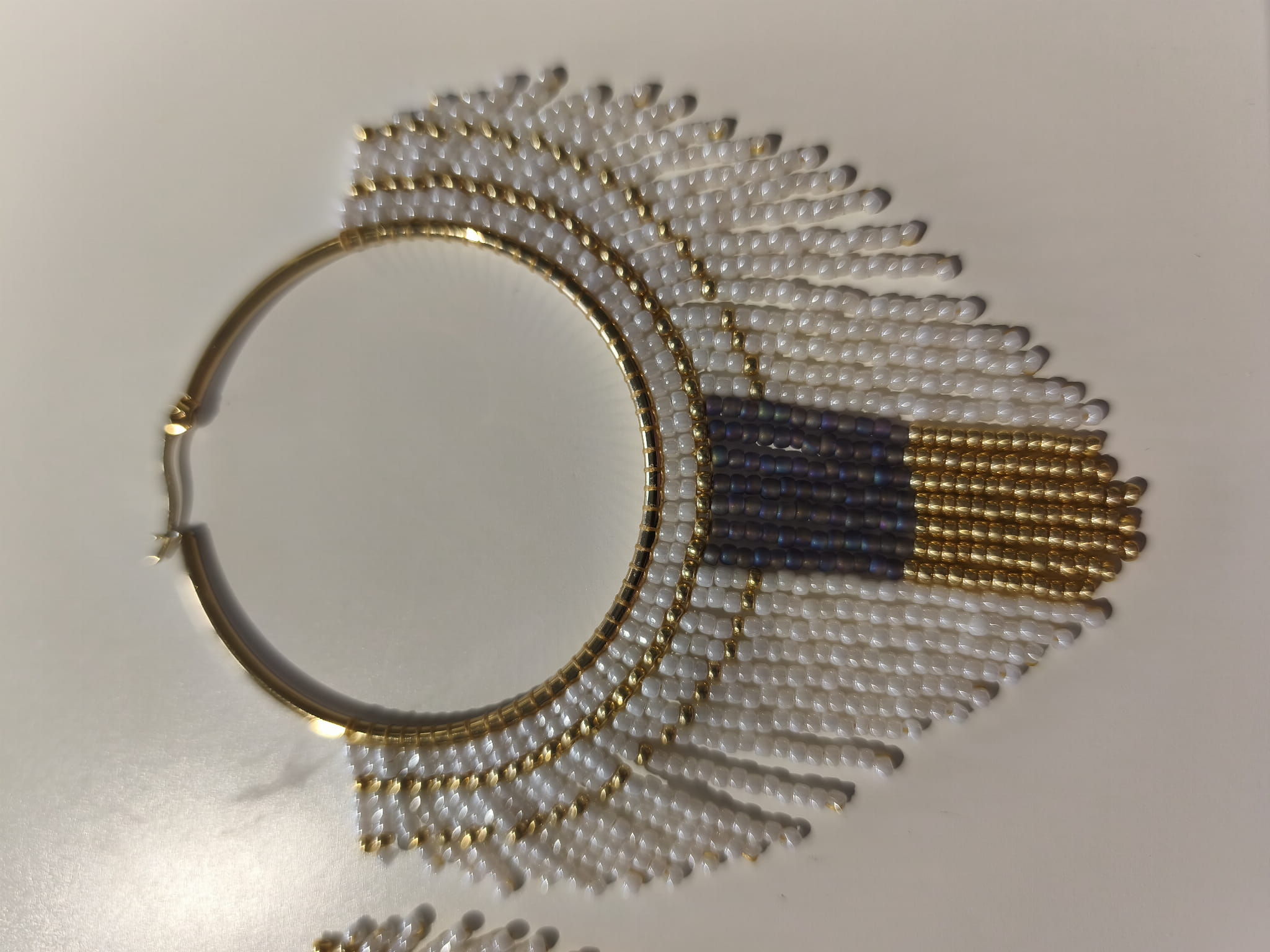 Kolczyki wykonane z drobnych koralików TOHO w eleganckiej kolorystyce bieli, fioletu i złota. Umieszczone na złotych kołach, tworzą subtelne, a zarazem efektowne połączenie klasy i blasku. Idealne dla osób ceniących rękodzieło i wyjątkowe dodatki. Doskonale sprawdzą się zarówno na co dzień, jak i na wyjątkowe okazje, dodając stylizacji delikatnego, kobiecego akcentu. Każda para to unikalny, starannie wykonany element biżuterii z dbałością o każdy detal.