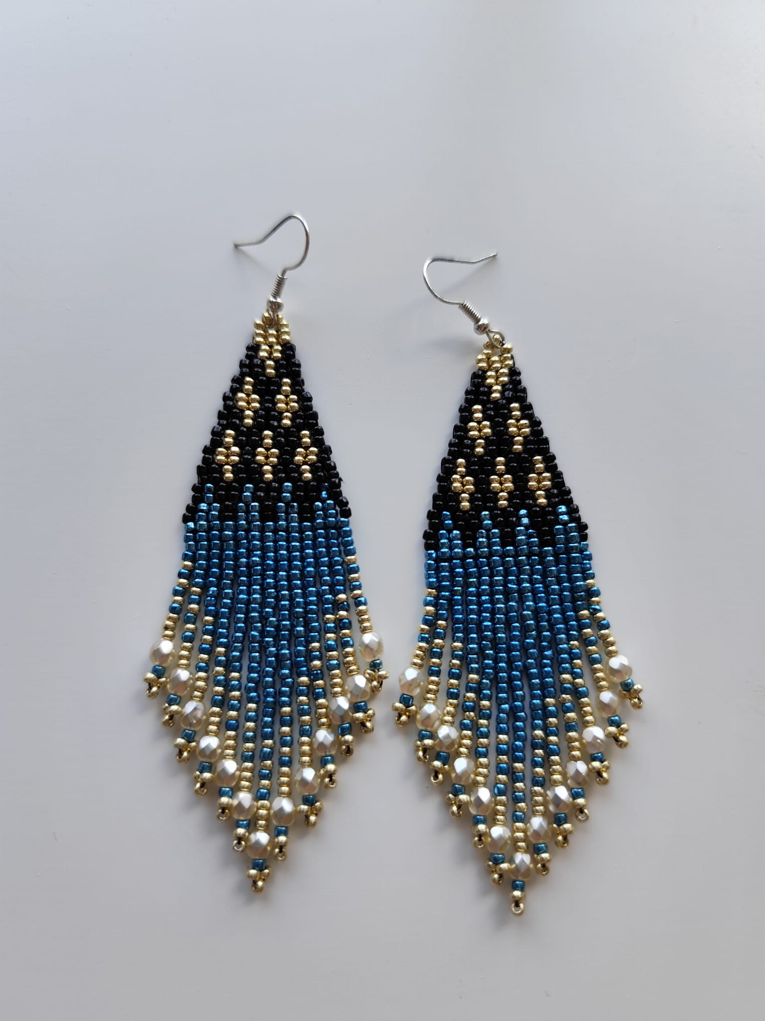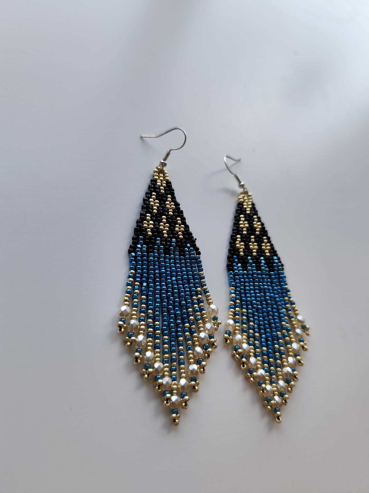 Zjawiskowe kolczyki ręcznie wykonane z drobnych, precyzyjnie dobranych koralików Toho w kolorach czerni, złota i głębokiego błękitu. Ich elegancka kompozycja łączy w sobie klasykę z nutą nowoczesności, tworząc biżuterię, która przyciąga wzrok i podkreśla indywidualny styl. Idealne zarówno na specjalne okazje, jak i jako efektowny akcent w codziennej stylizacji.