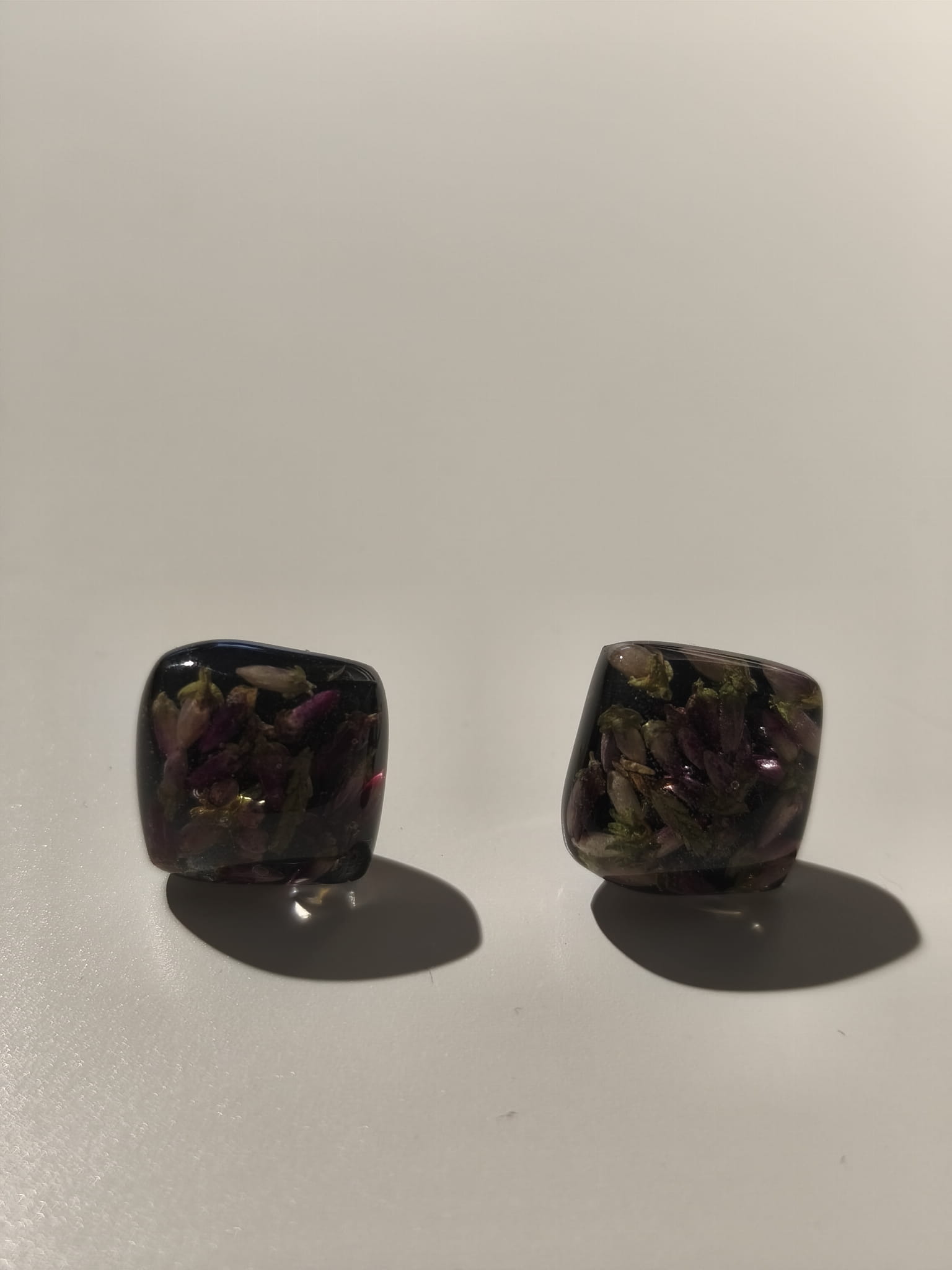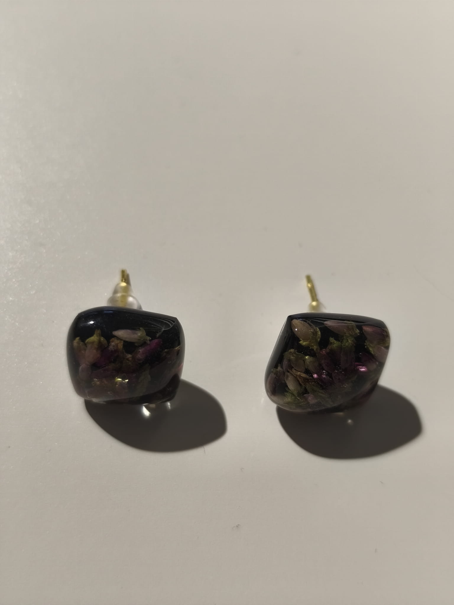 Kolczyki z wrzosem zatopionym w ciemnej żywicy