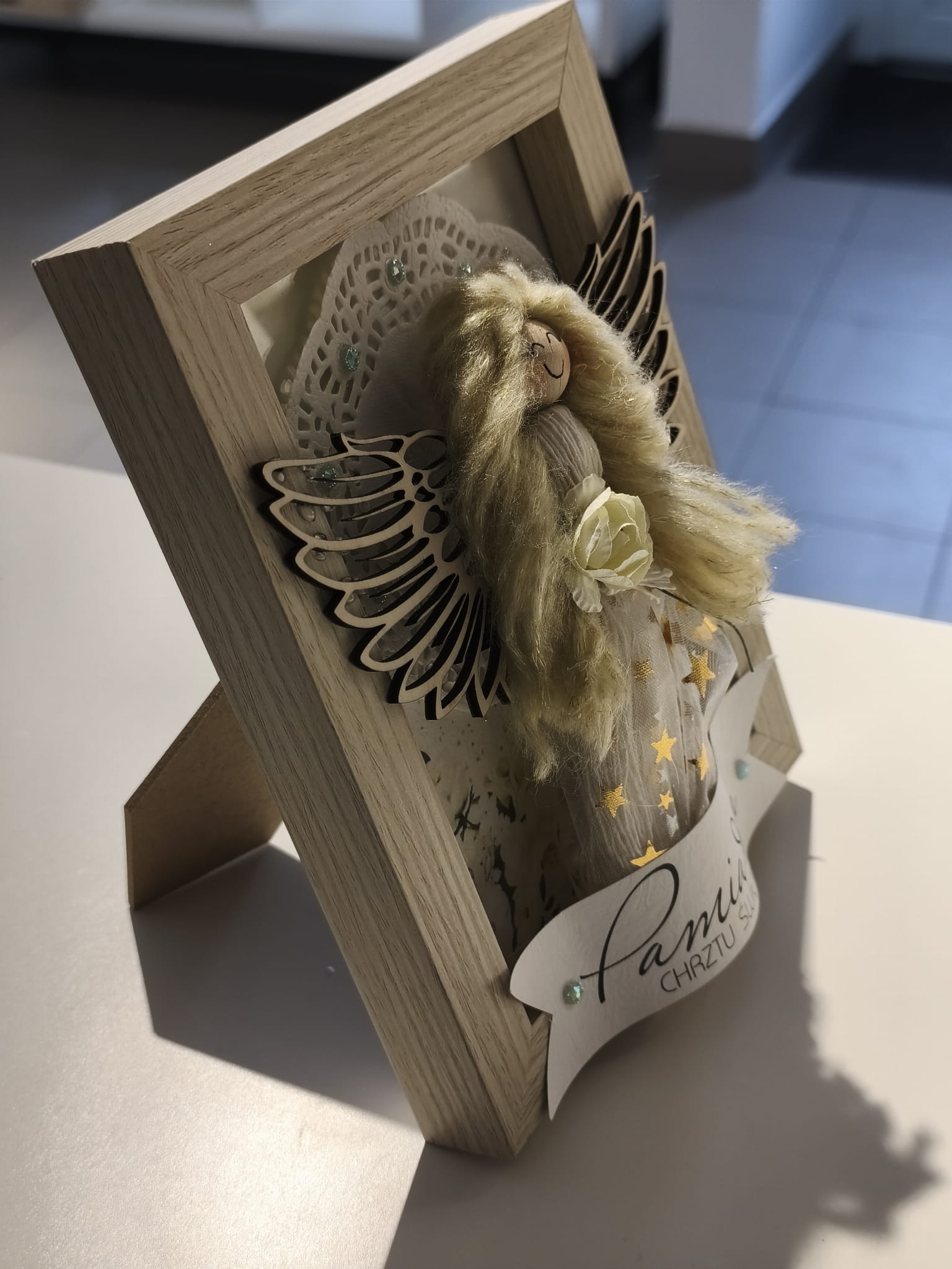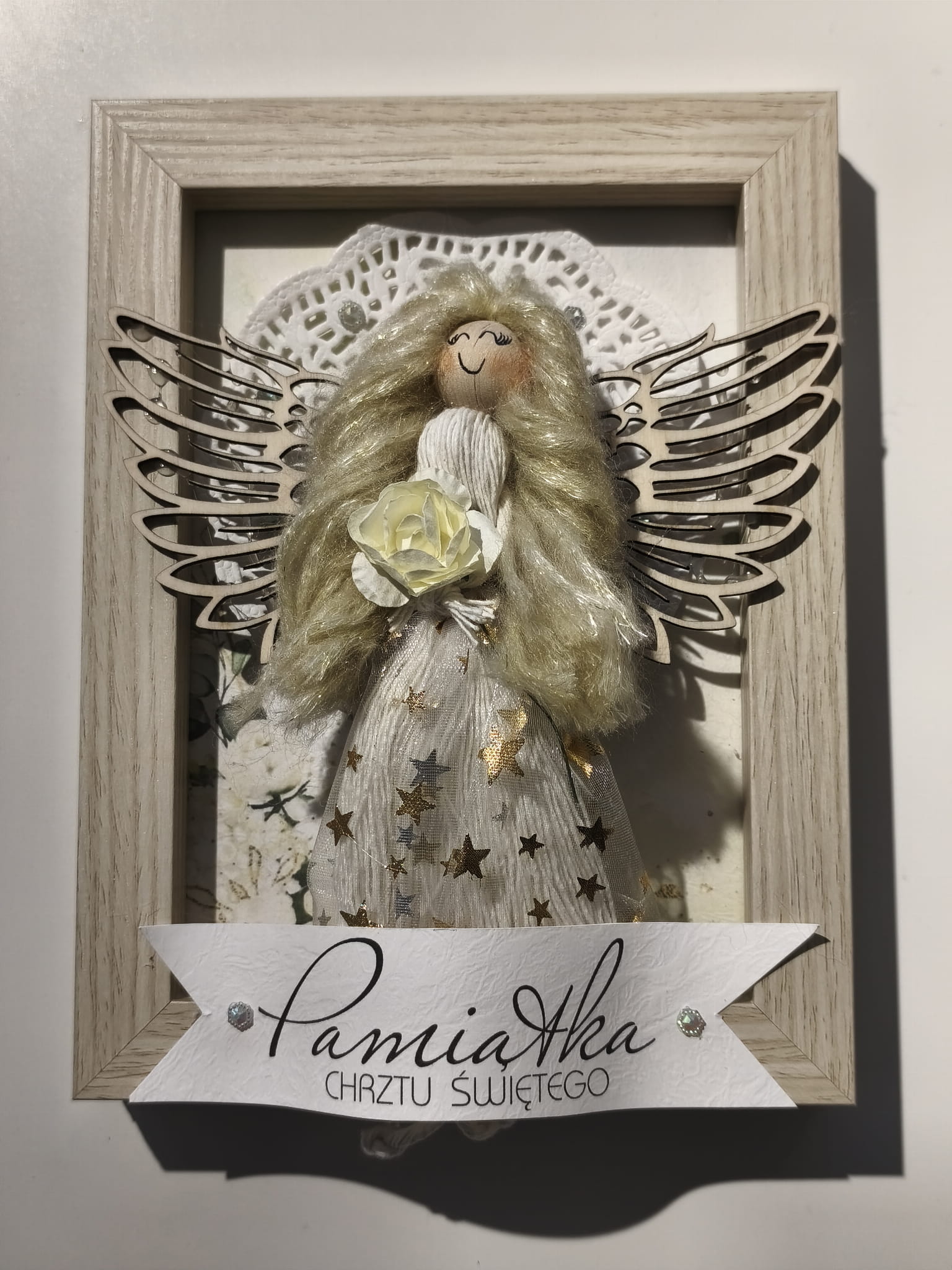 Wyjątkowy, ręcznie wykonany obrazek przedstawiający Anioła Stróża to piękna i trwała pamiątka z okazji Chrztu Świętego. Każdy szczegół został starannie wykonany ręcznie, co nadaje pracy niepowtarzalny charakter i wyjątkową wartość sentymentalną.