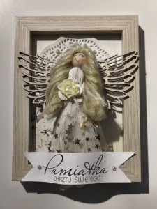 Ten unikatowy rękodzielniczy obrazek łączy w sobie duchowy wymiar uroczystości z elegancją i ciepłem domowego wnętrza.