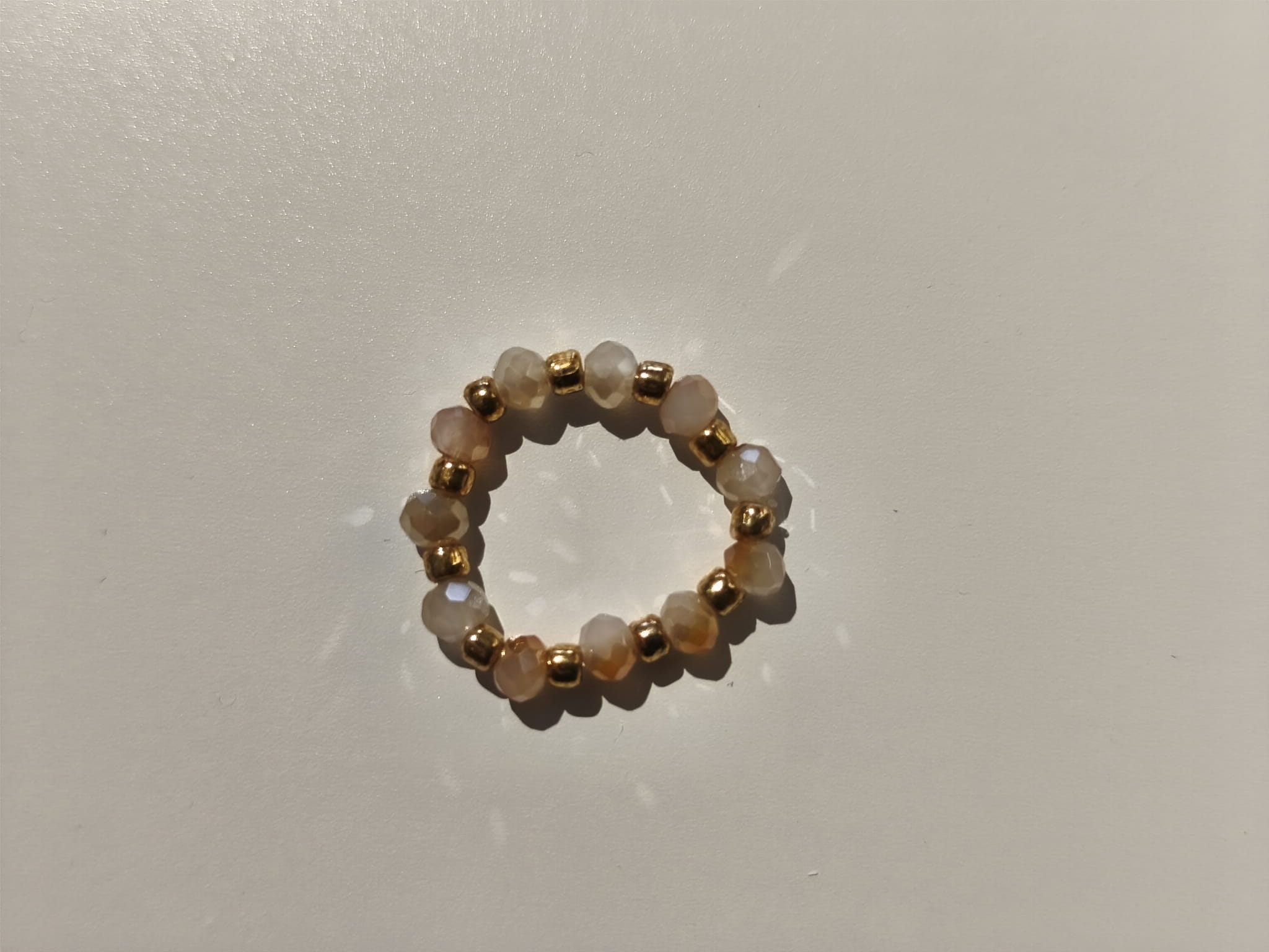 Pierścionek z mleczno-brzoskwiniowymi kamieniami oraz złotymi koralikami TOHO