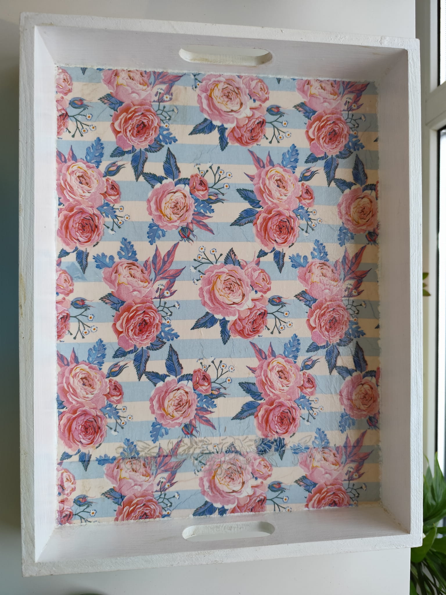 Wyjątkowa, ręcznie dekorowana taca z drewna, która łączy w sobie romantyzm kwiatowego wzoru z elegancją klasycznych pasków. Motyw róż w delikatnych, vintage’owych tonacjach pięknie współgra z subtelnymi pasami, tworząc kompozycję pełną uroku i ponadczasowego stylu.