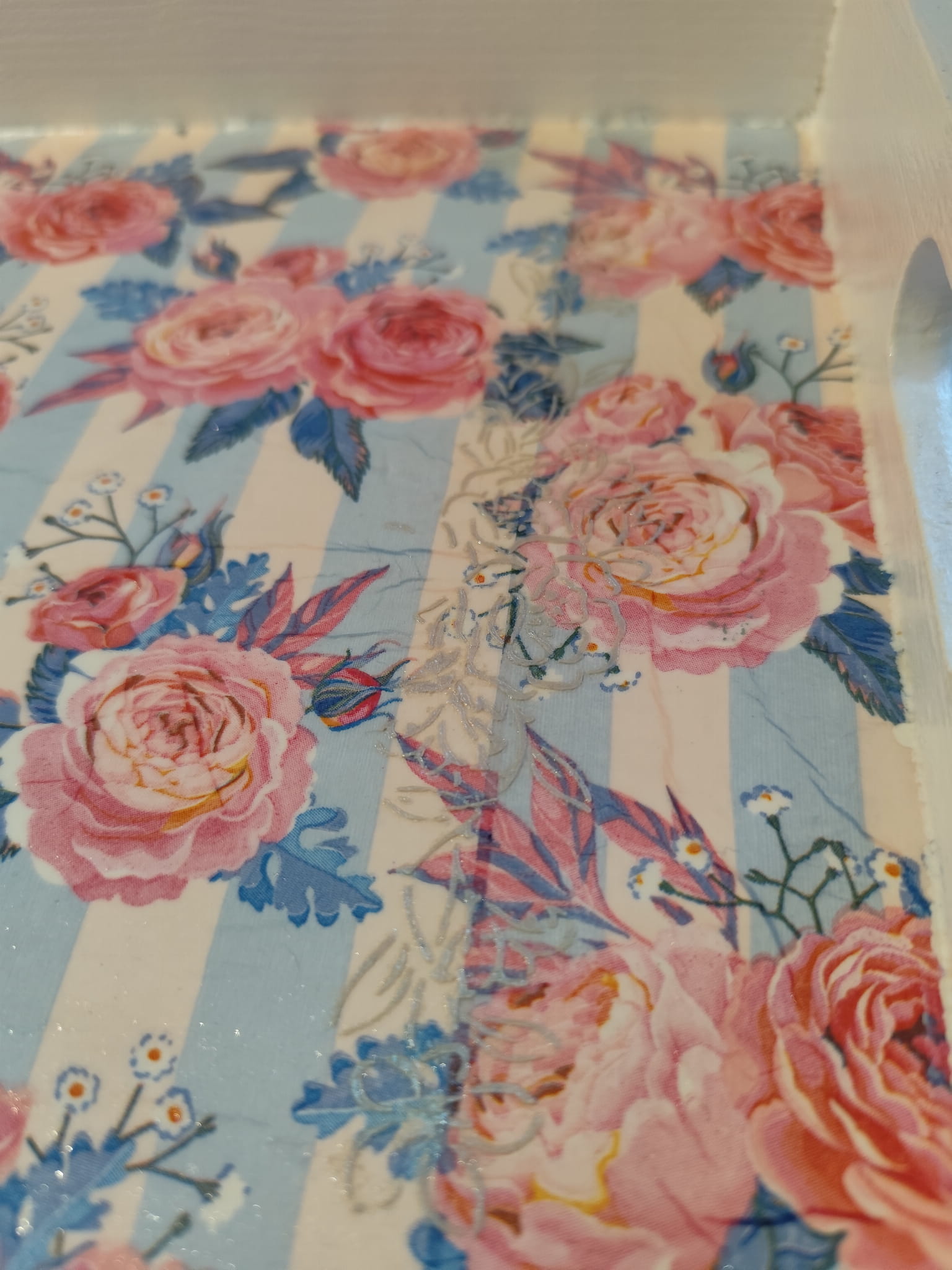 Taca drewniana zdobiona ręcznie z motywem róż i pasków, dekorowana mieniącą się kolorem błękitnym pastą woskową.