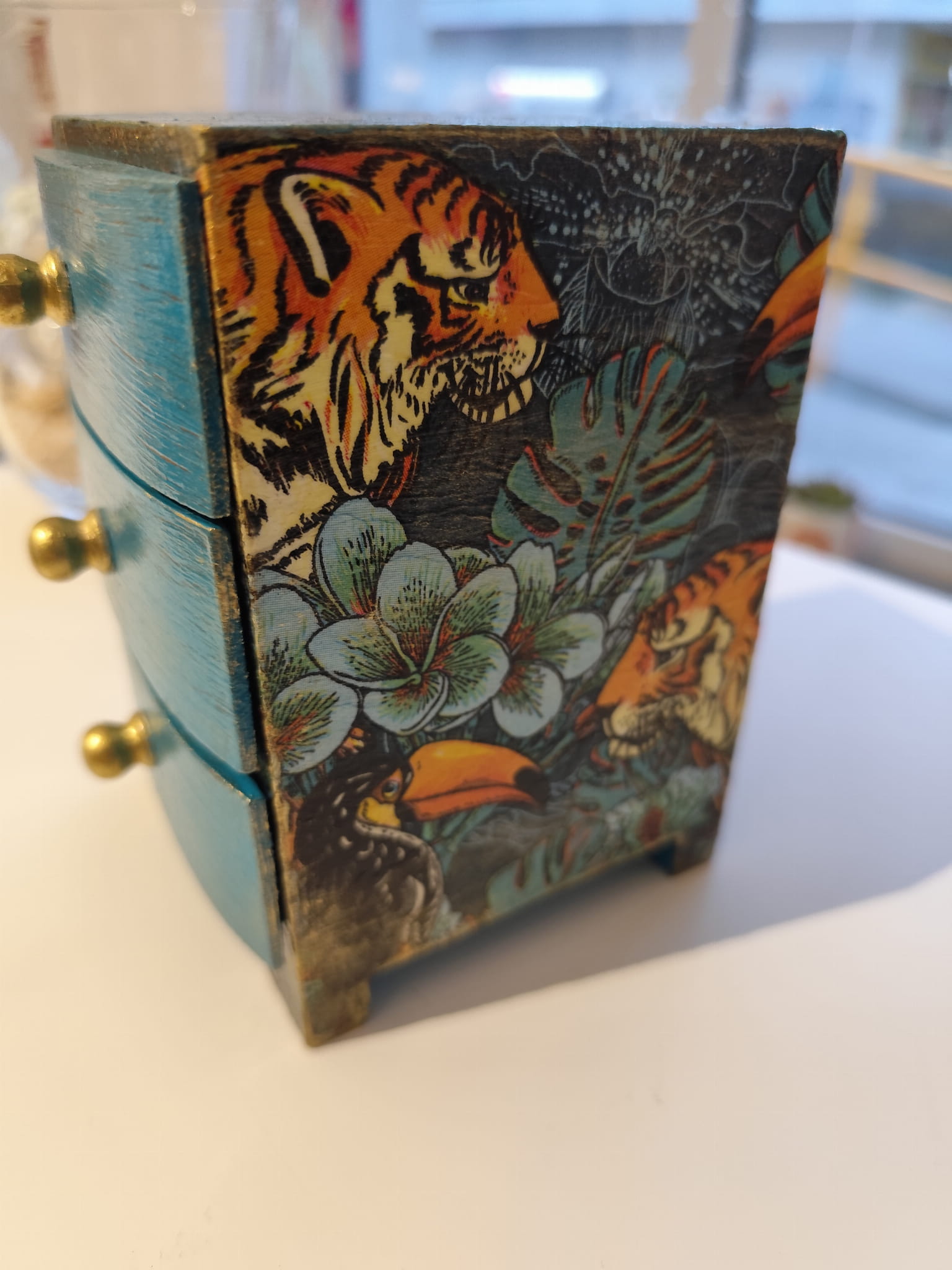 Ręcznie zdobiona drewniana komódka z motywem tygrysów
