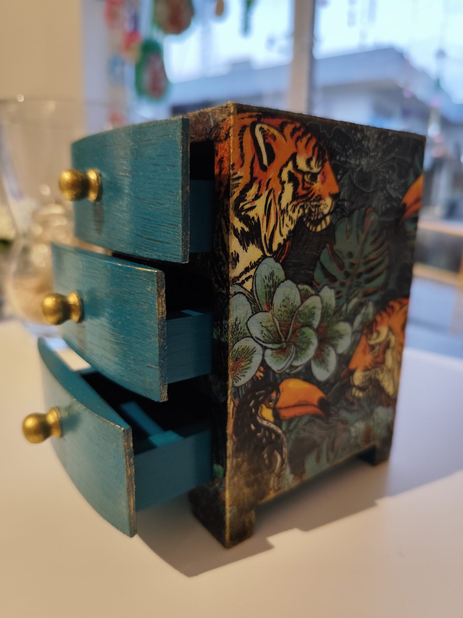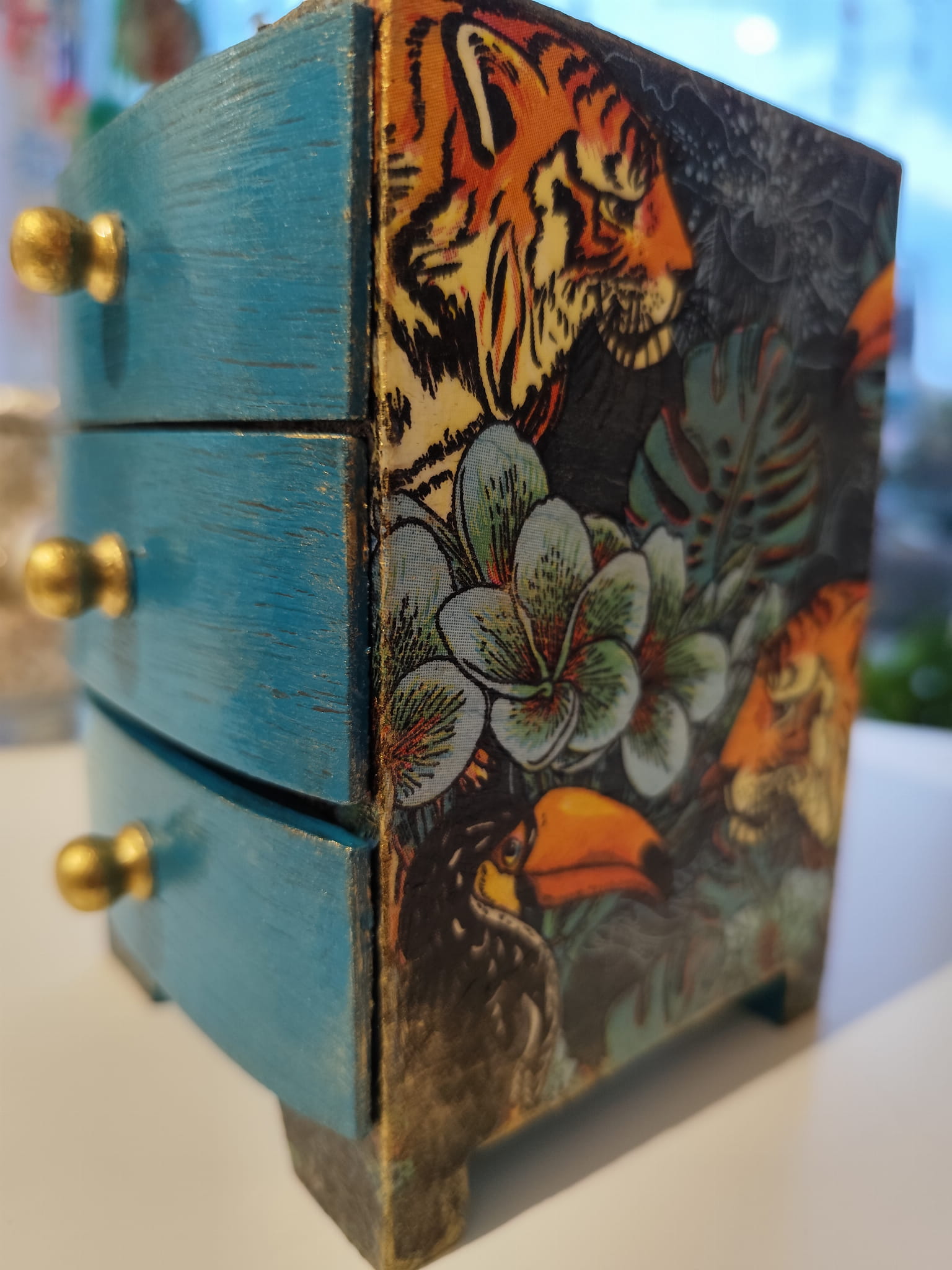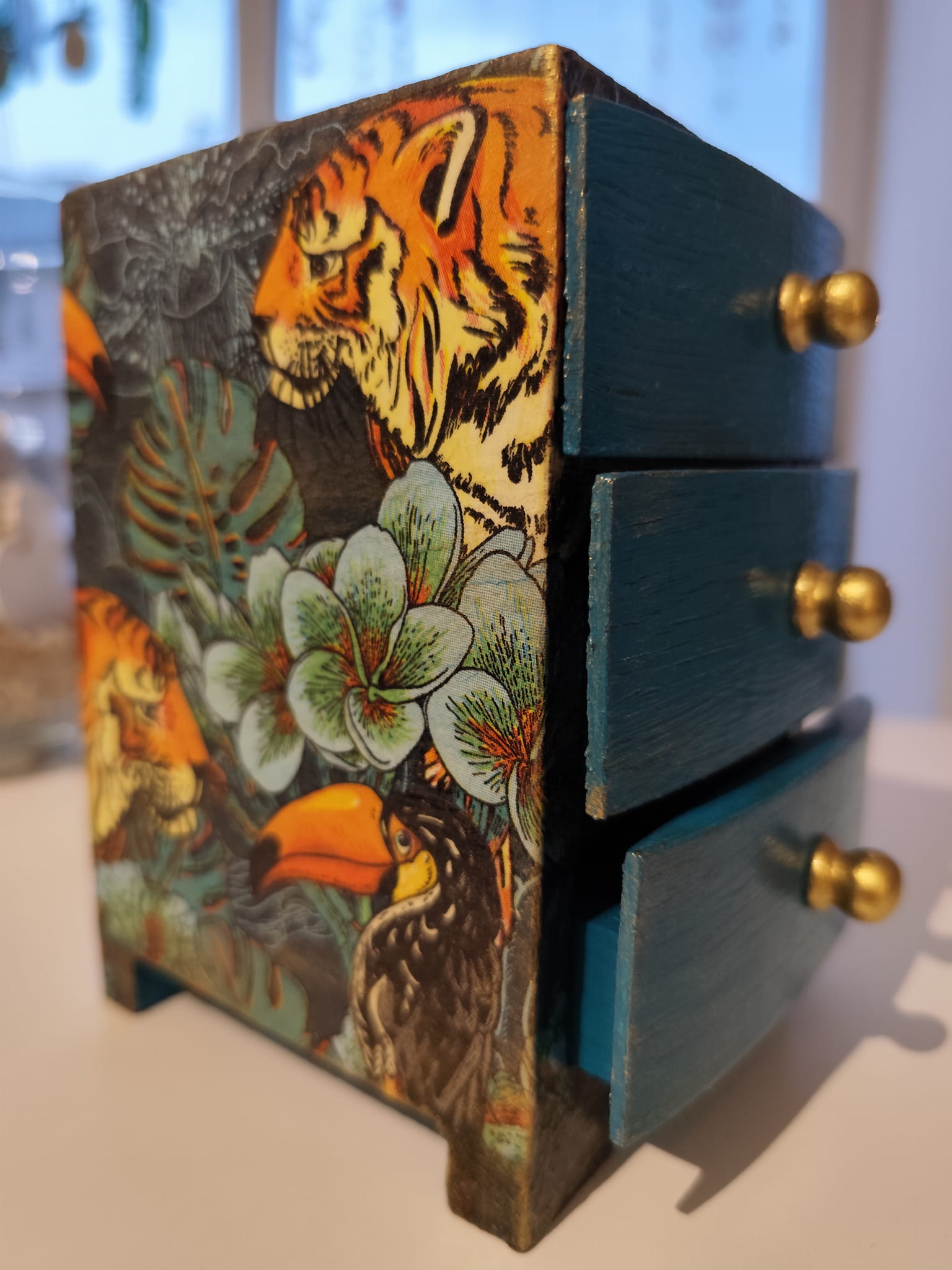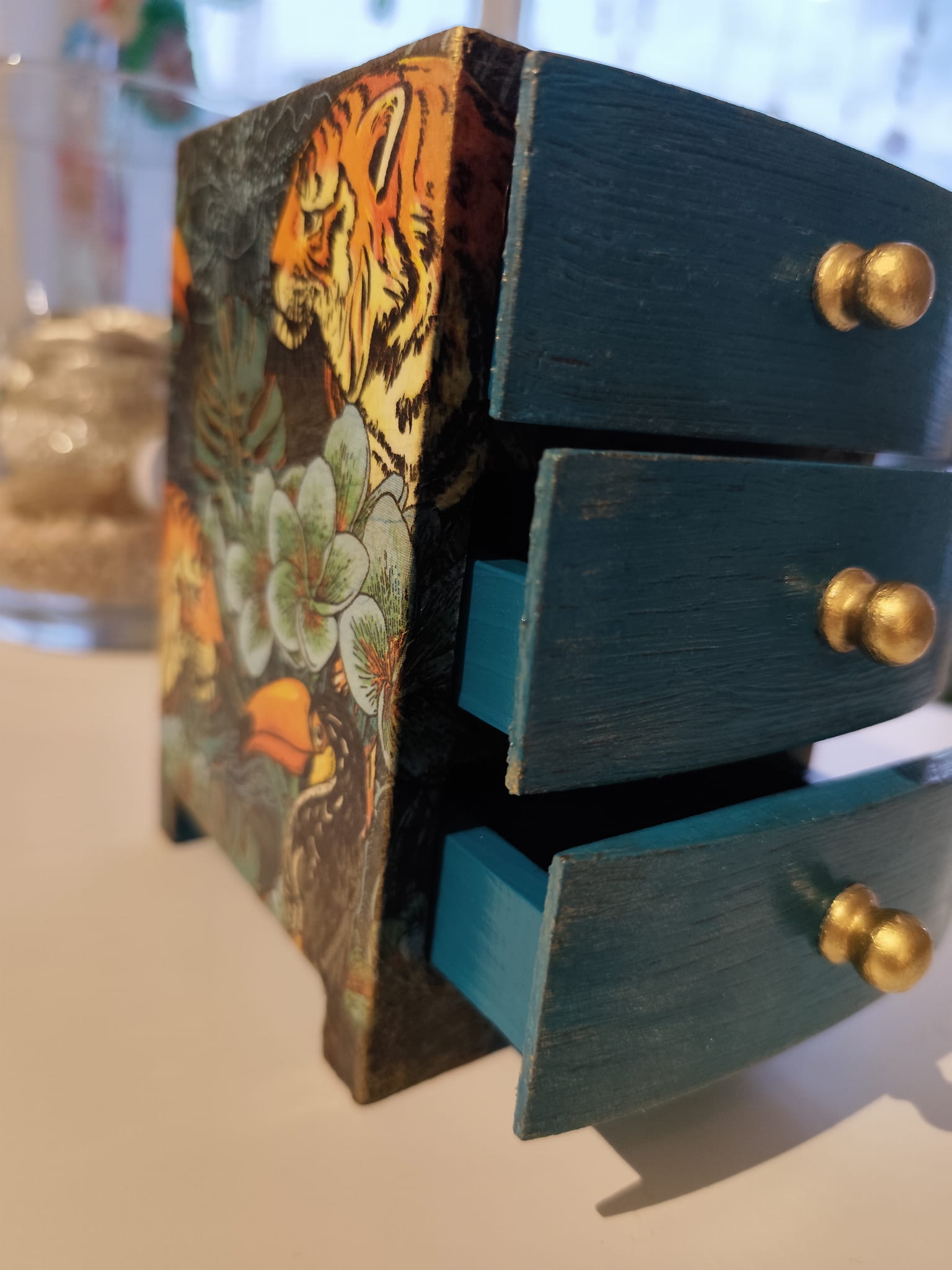 Każda szufladka została ozdobiona z dbałością o detale – majestatyczne tygrysy w otoczeniu roślinności wprowadzają egzotyczny, artystyczny akcent, a przecierki i patynowane wykończenia dodają całości szlachetnej surowości.