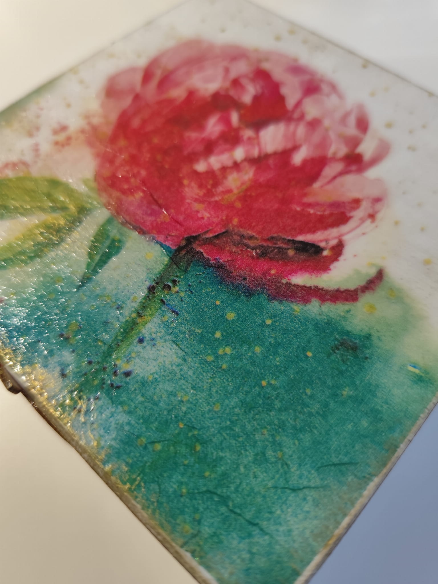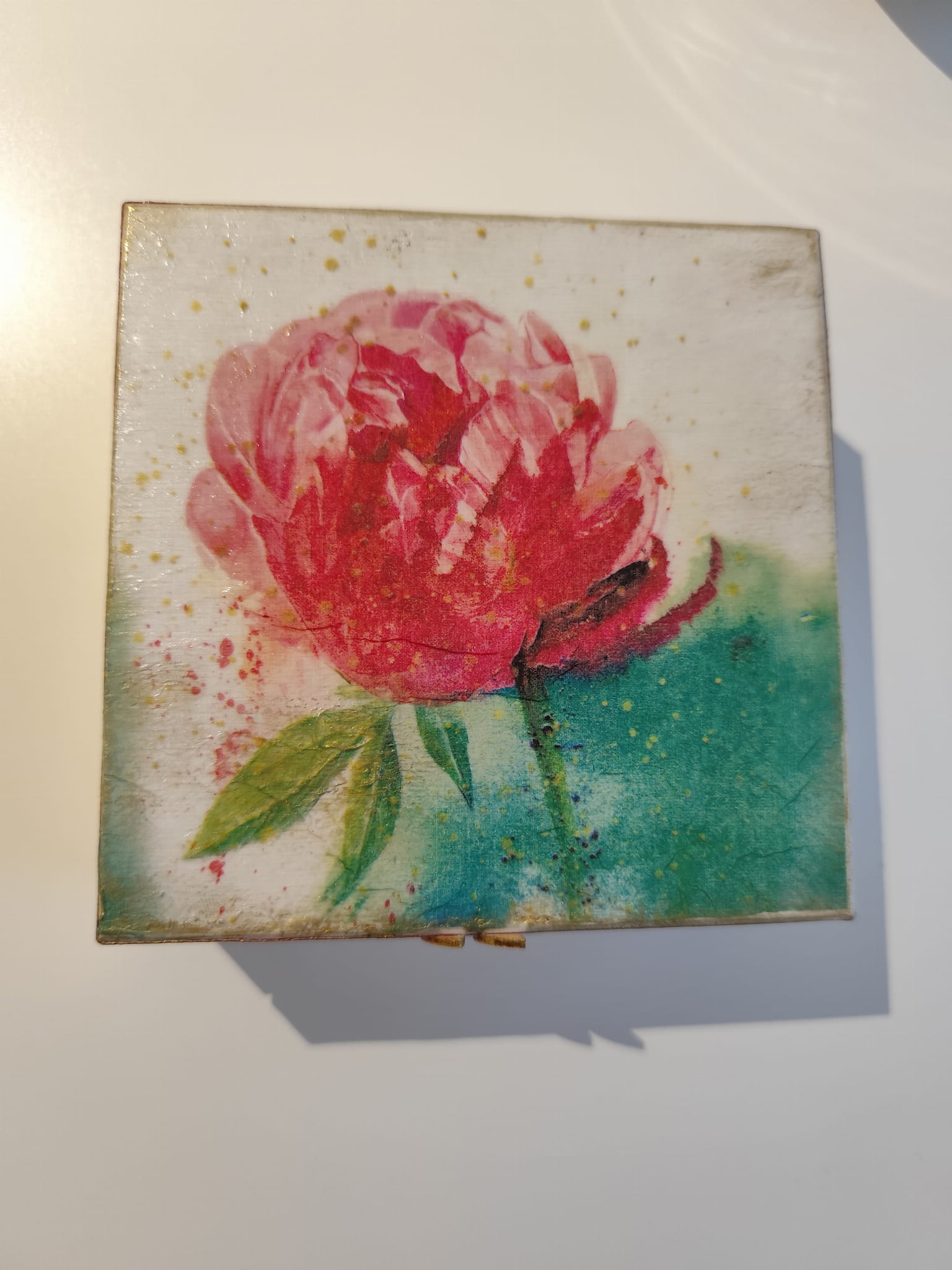 Zdobienie: technika decoupage z motywem piwonii + drewniany element dekoracyjny