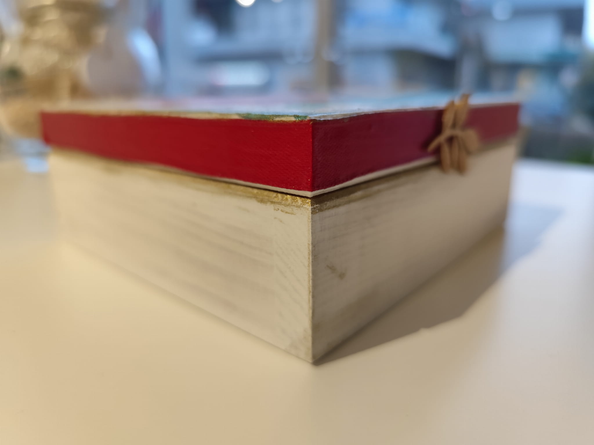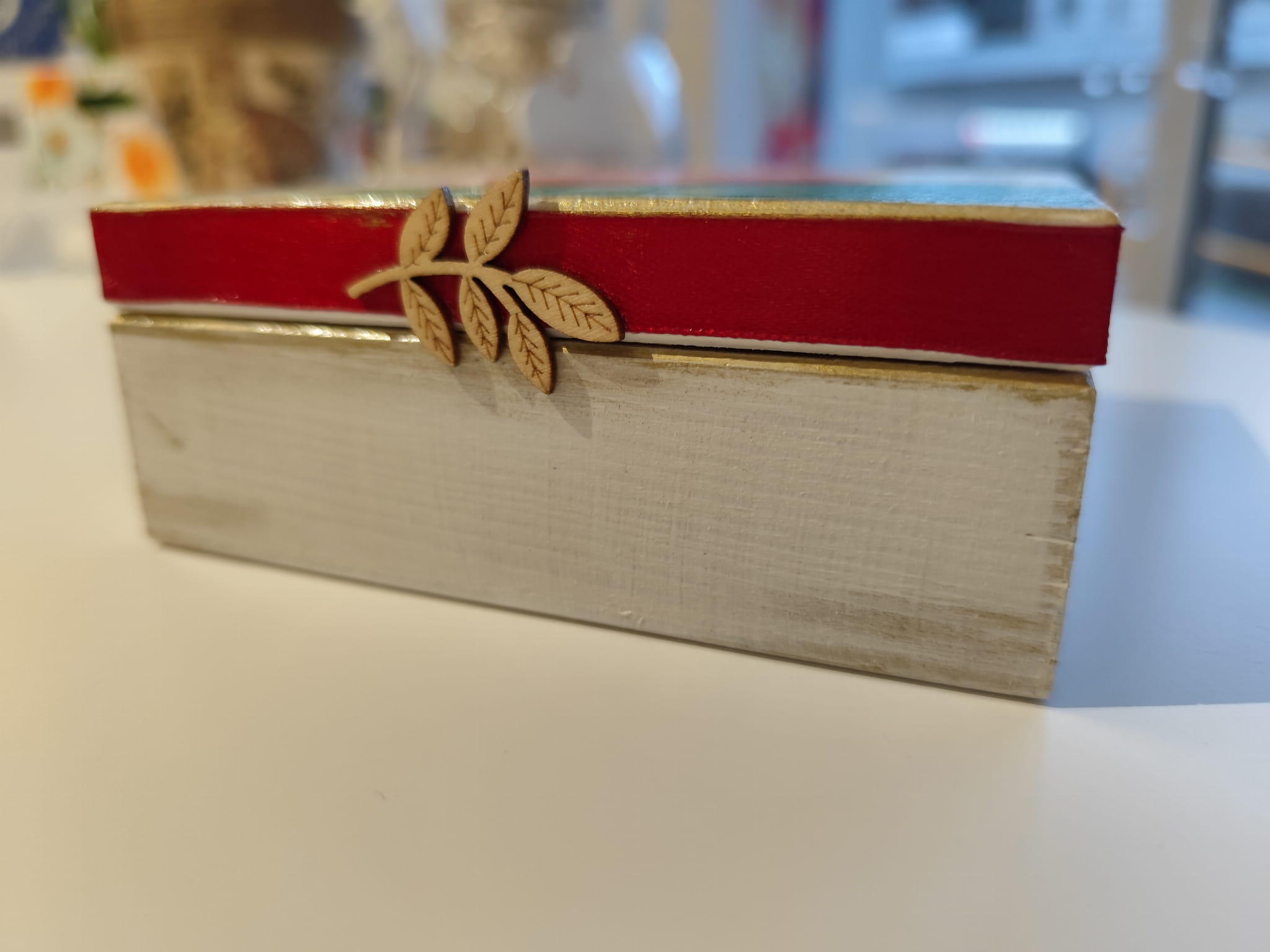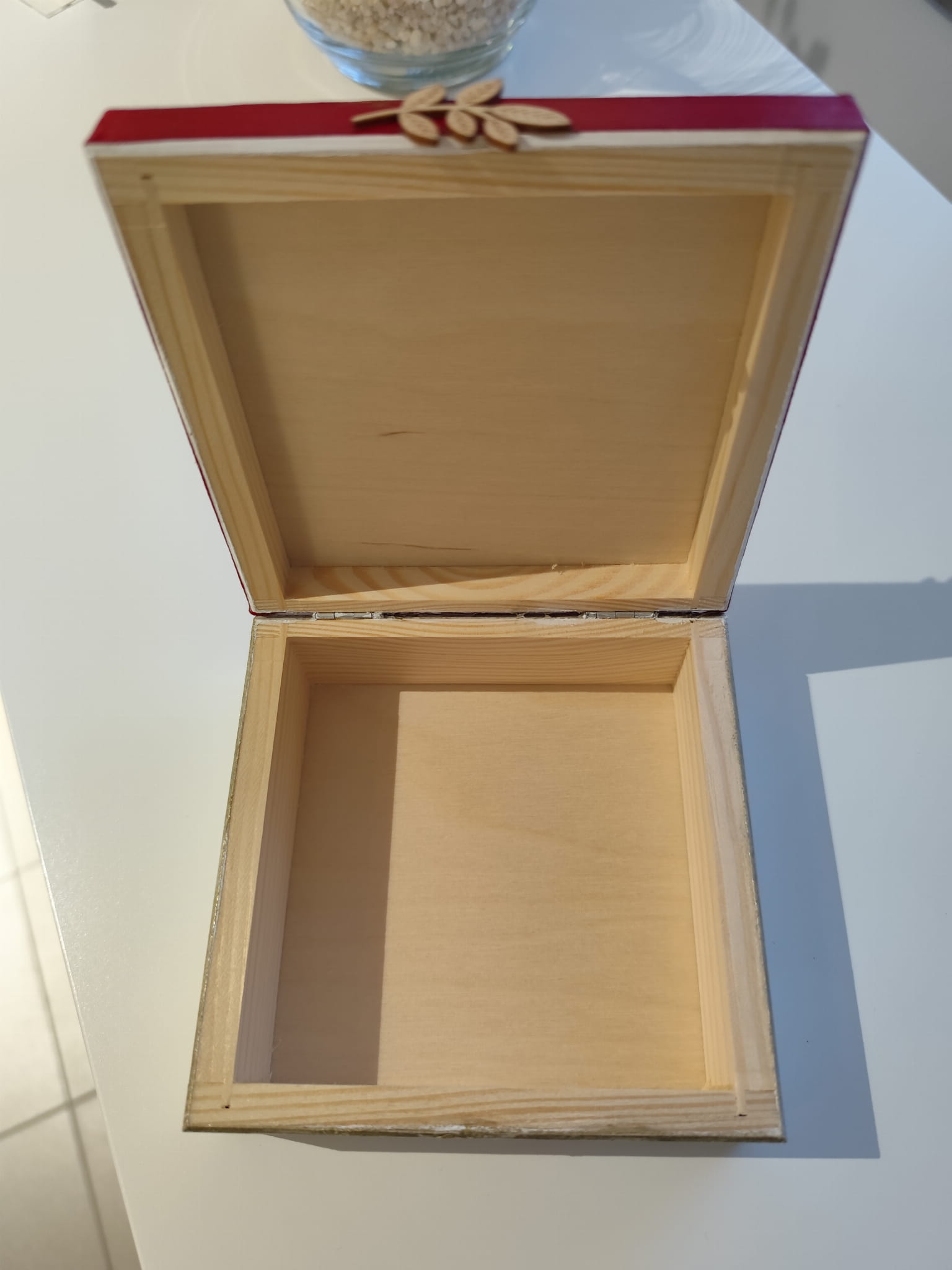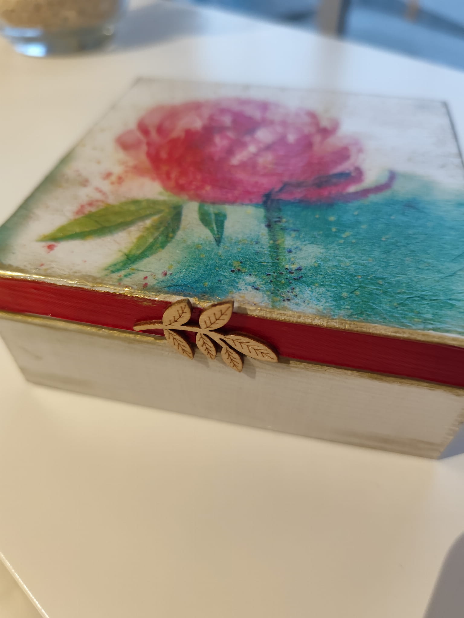 Drewniana szkatułka ręcznie ozdobiona motywem piwonii, z czerwoną wstążką oraz drewnianym dekorem.