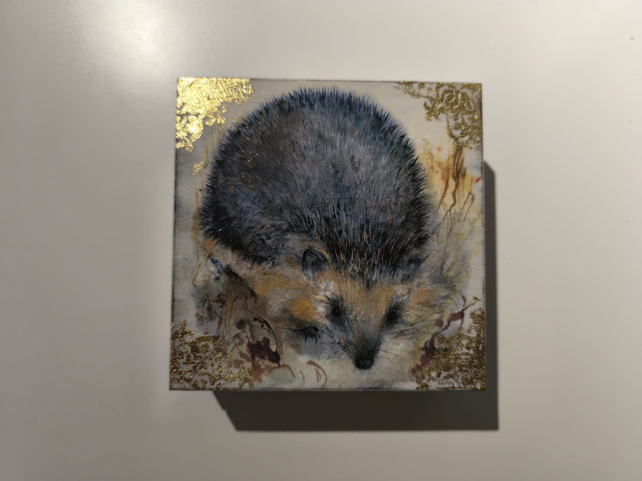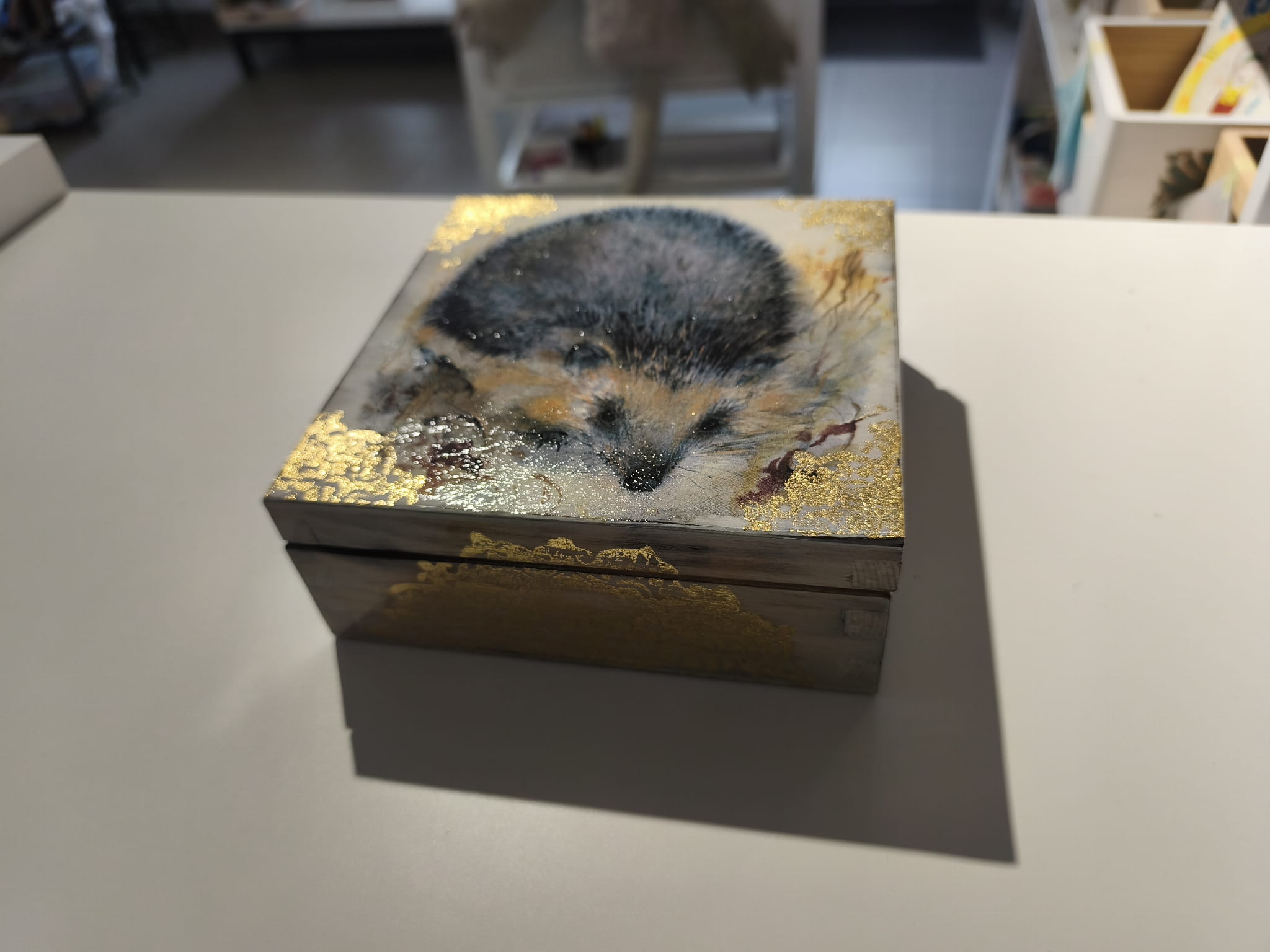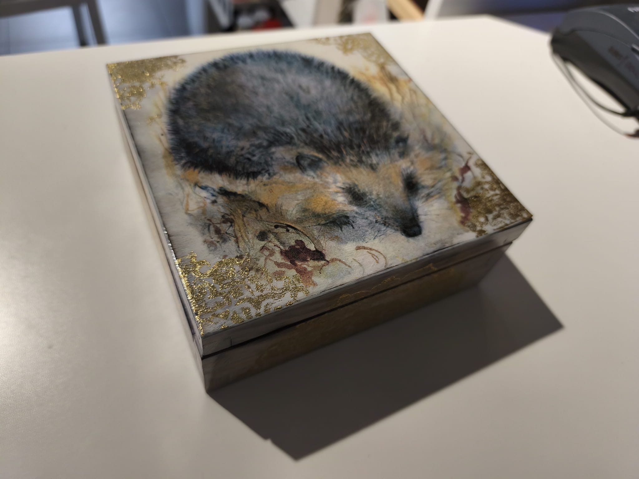 Ręcznie zdobiona drewniana szkatułka z motywem jeża