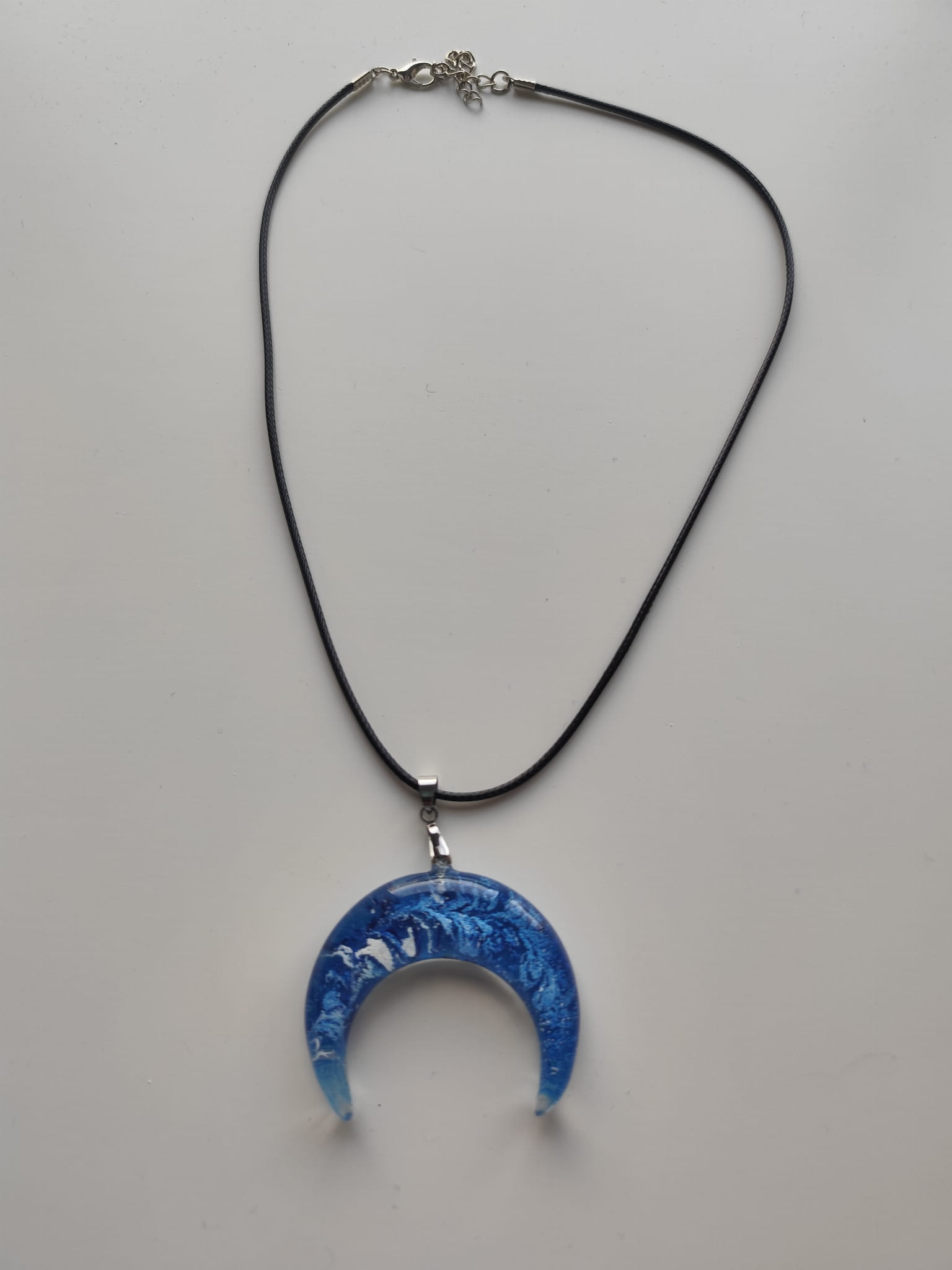 Unikalna zawieszka z błękitnej żywicy z wzorem w stylu morskich fal na czarnym sznurku jubilerskim
