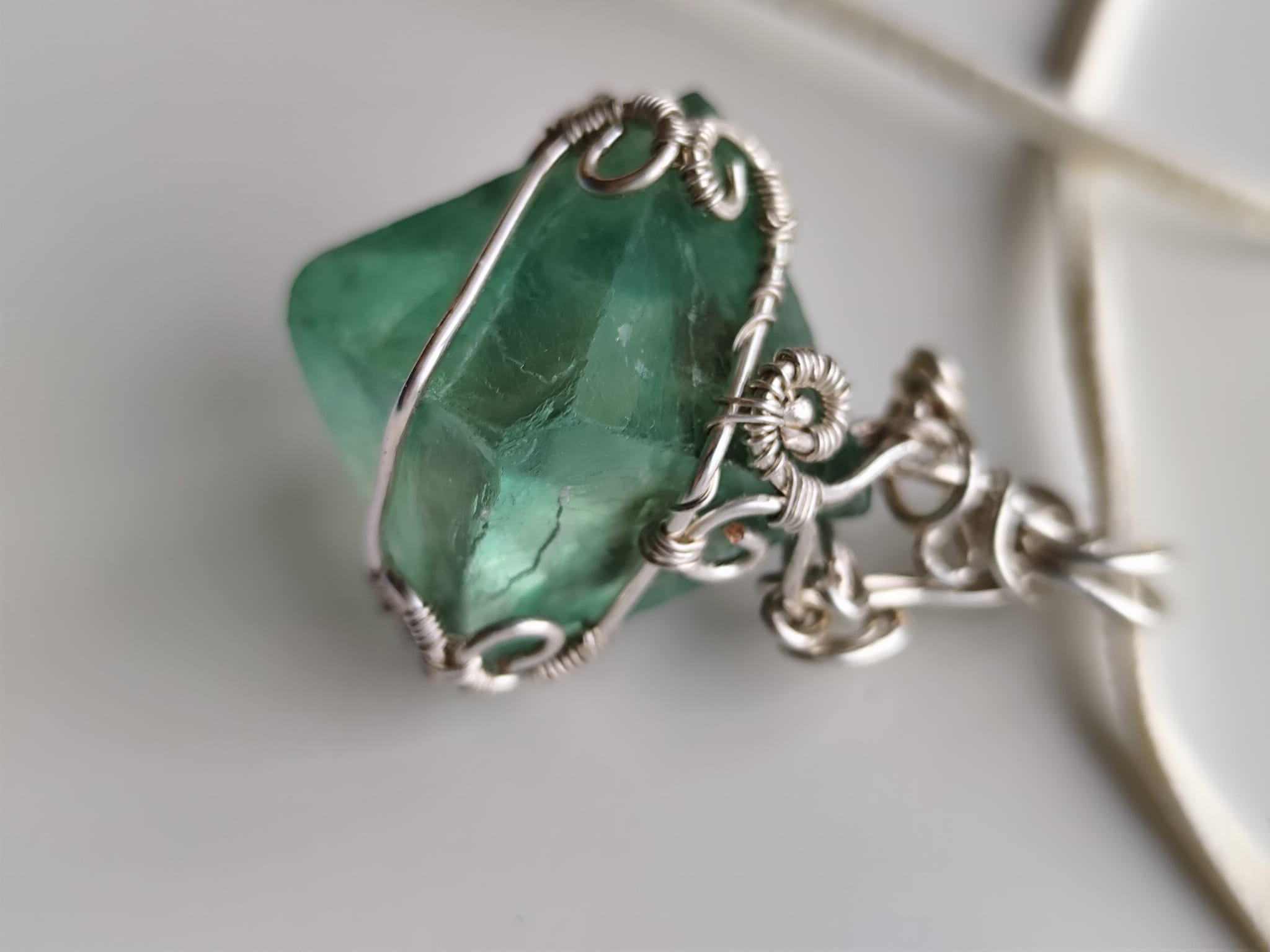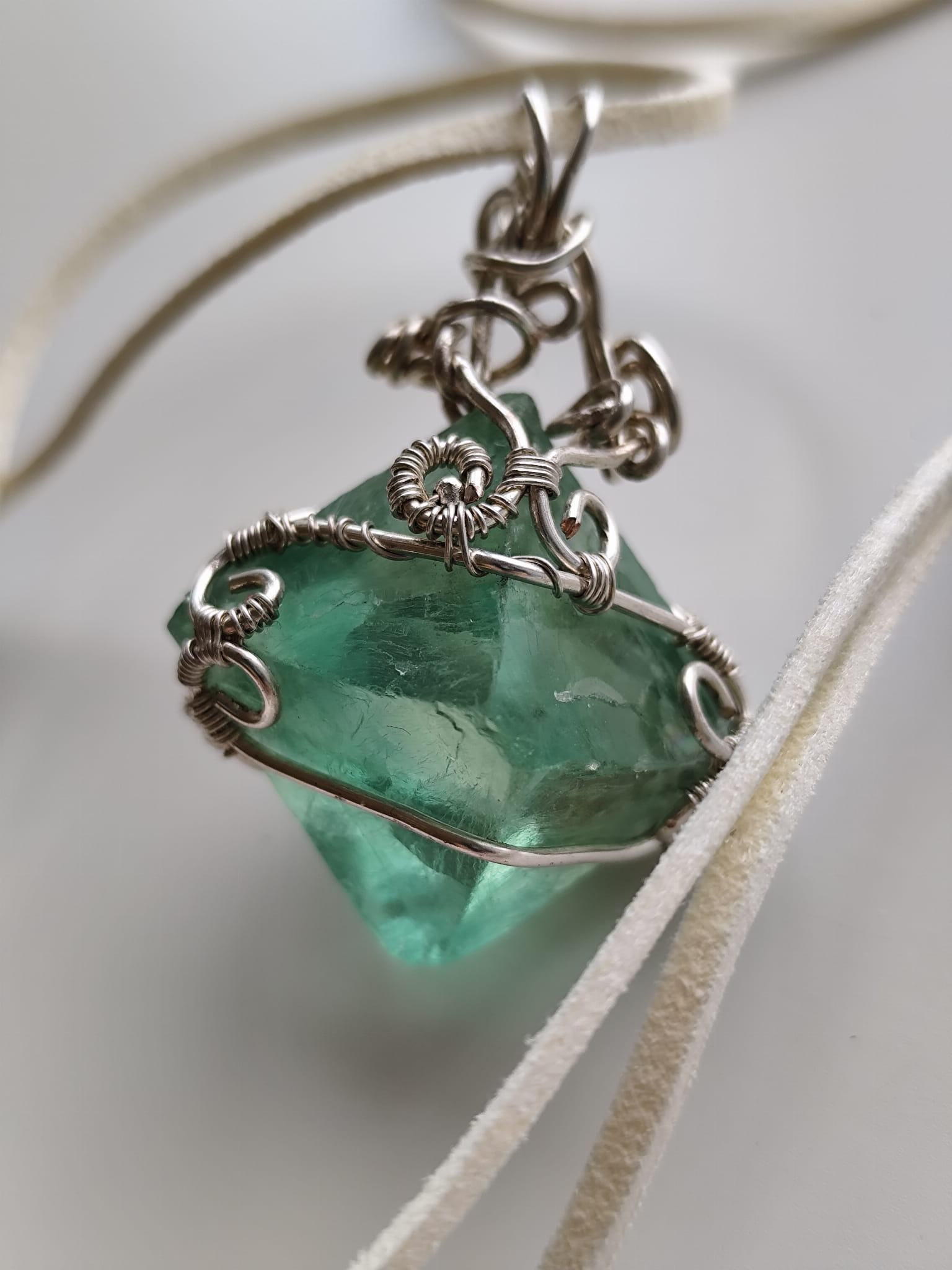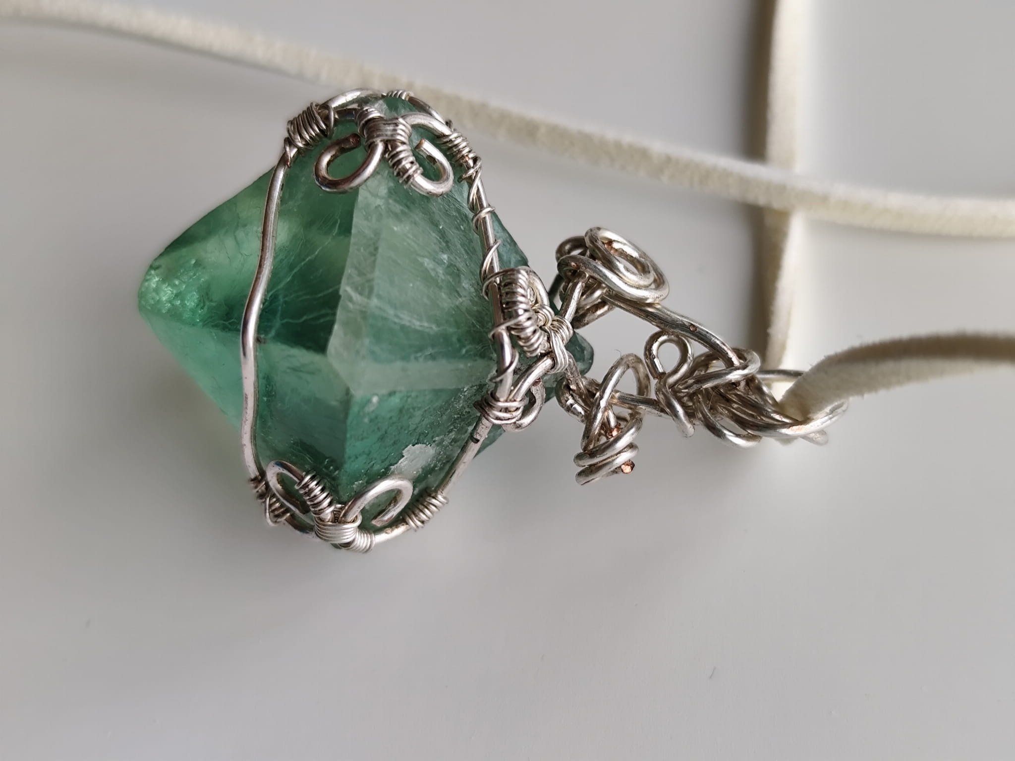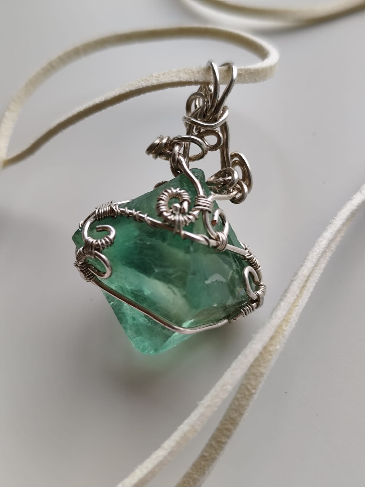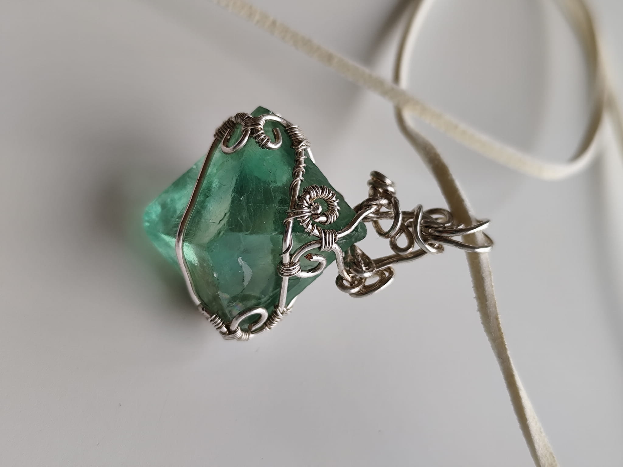 Ręcznie wykonany wisiorek z naturalnego fluorytu – kamienia znanego ze swojej wielobarwnej struktury i właściwości wspierających równowagę umysłu. Kryształ został misternie opleciony cienkim, miedzianym drucikiem pokrytym warstwą srebra, tworząc unikalną, subtelną oprawę, która podkreśla piękno kamienia i nadaje mu artystycznego charakteru.