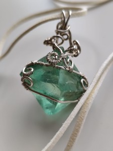 Wisiorek z naturalnego fluorytu opleciony posrebrzanym drutem