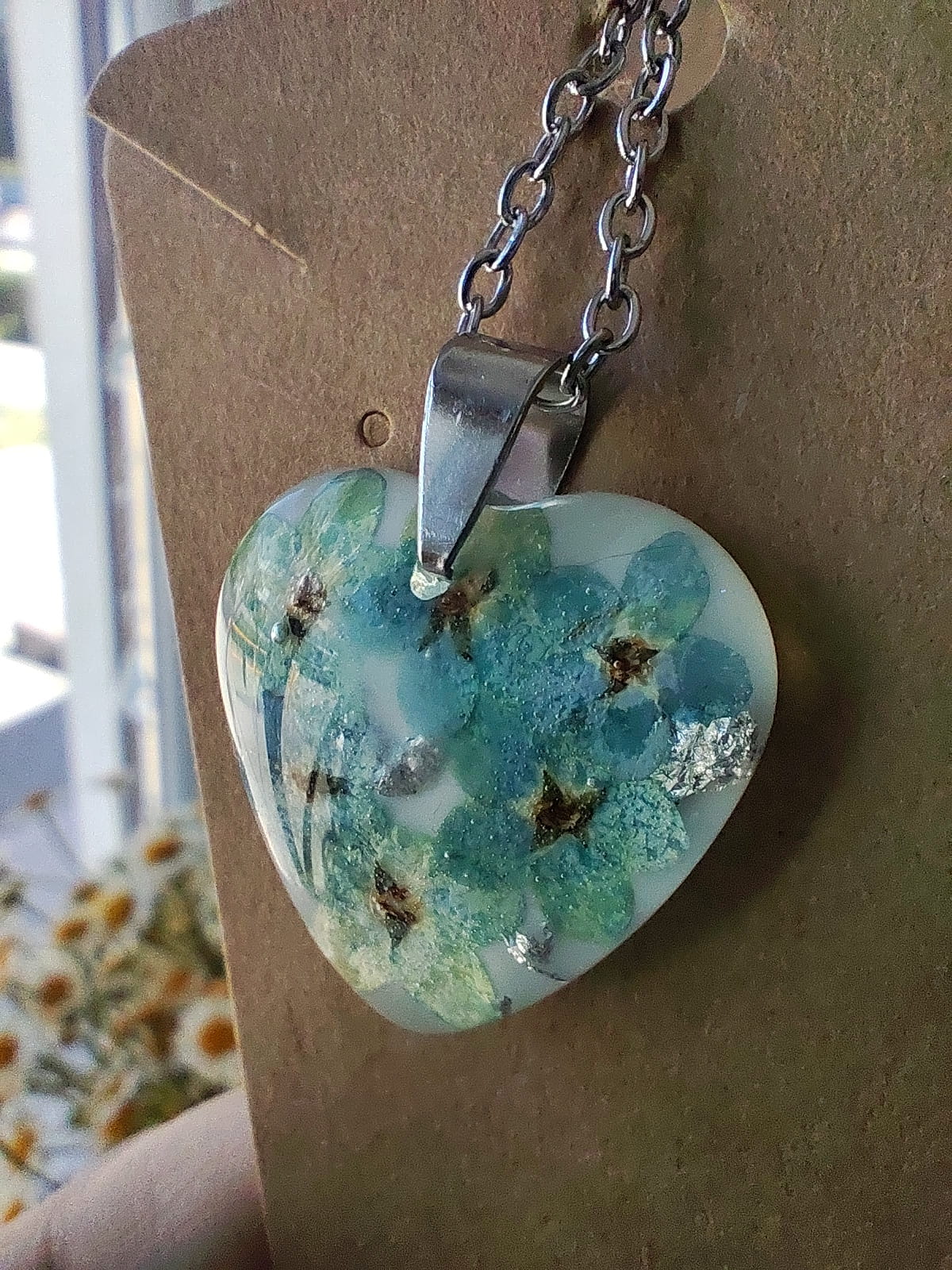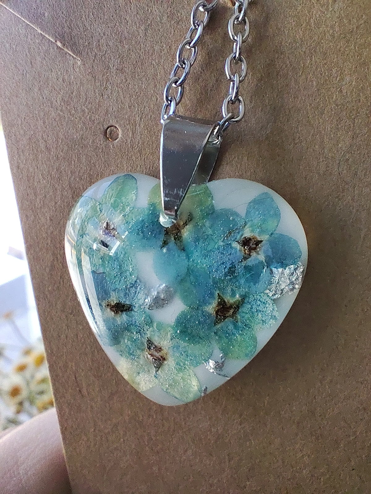 Romantyczna zawieszka w formie serca, wykonana ręcznie z przezroczystej żywicy epoksydowej, w której zatopione zostały drobne, niebieskie kwiatki niezapominajki oraz delikatna srebrna folia.