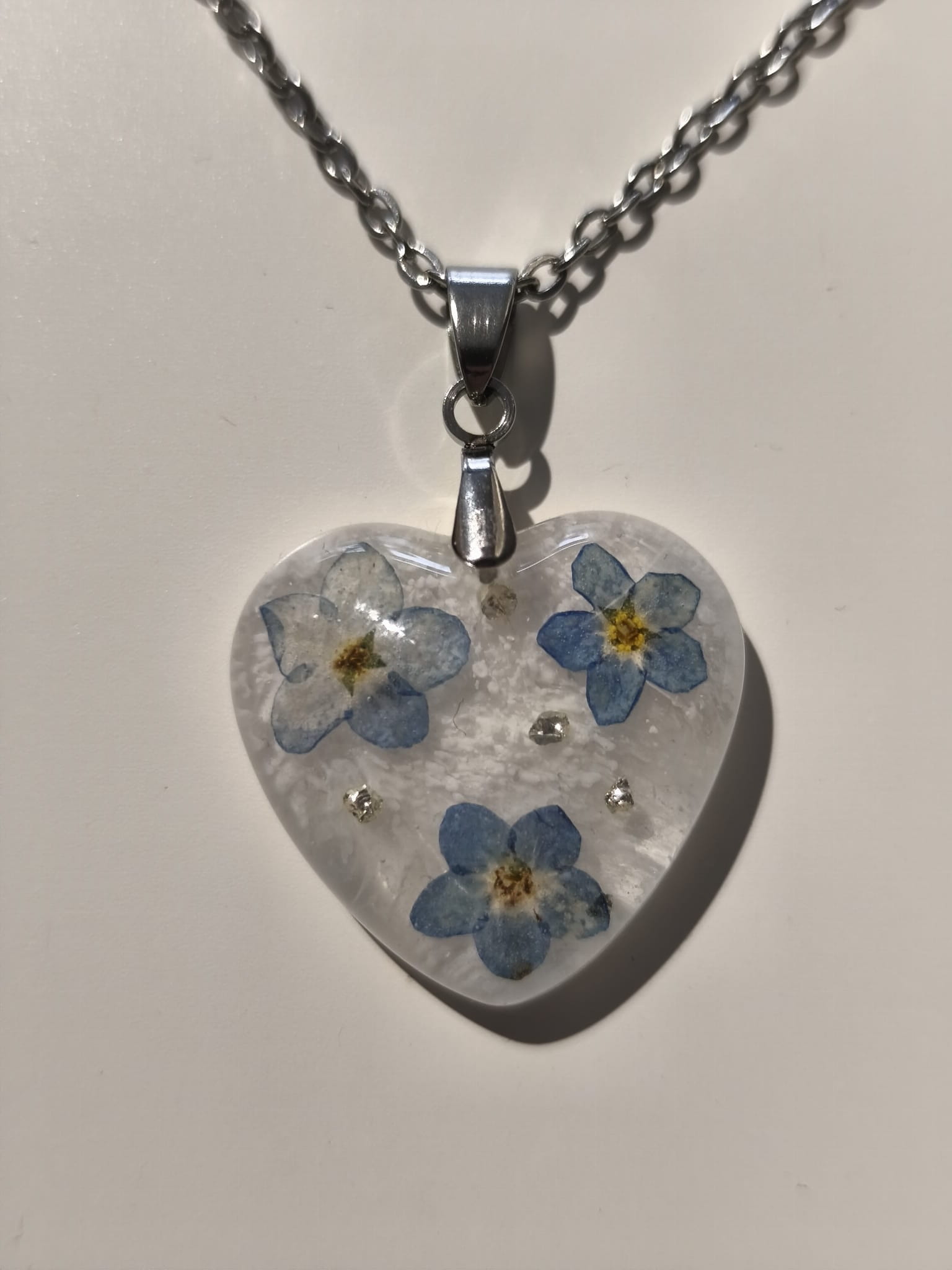 Zawieszka w kształcie serca z suszonymi niezapominajkami zatopionymi w jasnej żywicy
