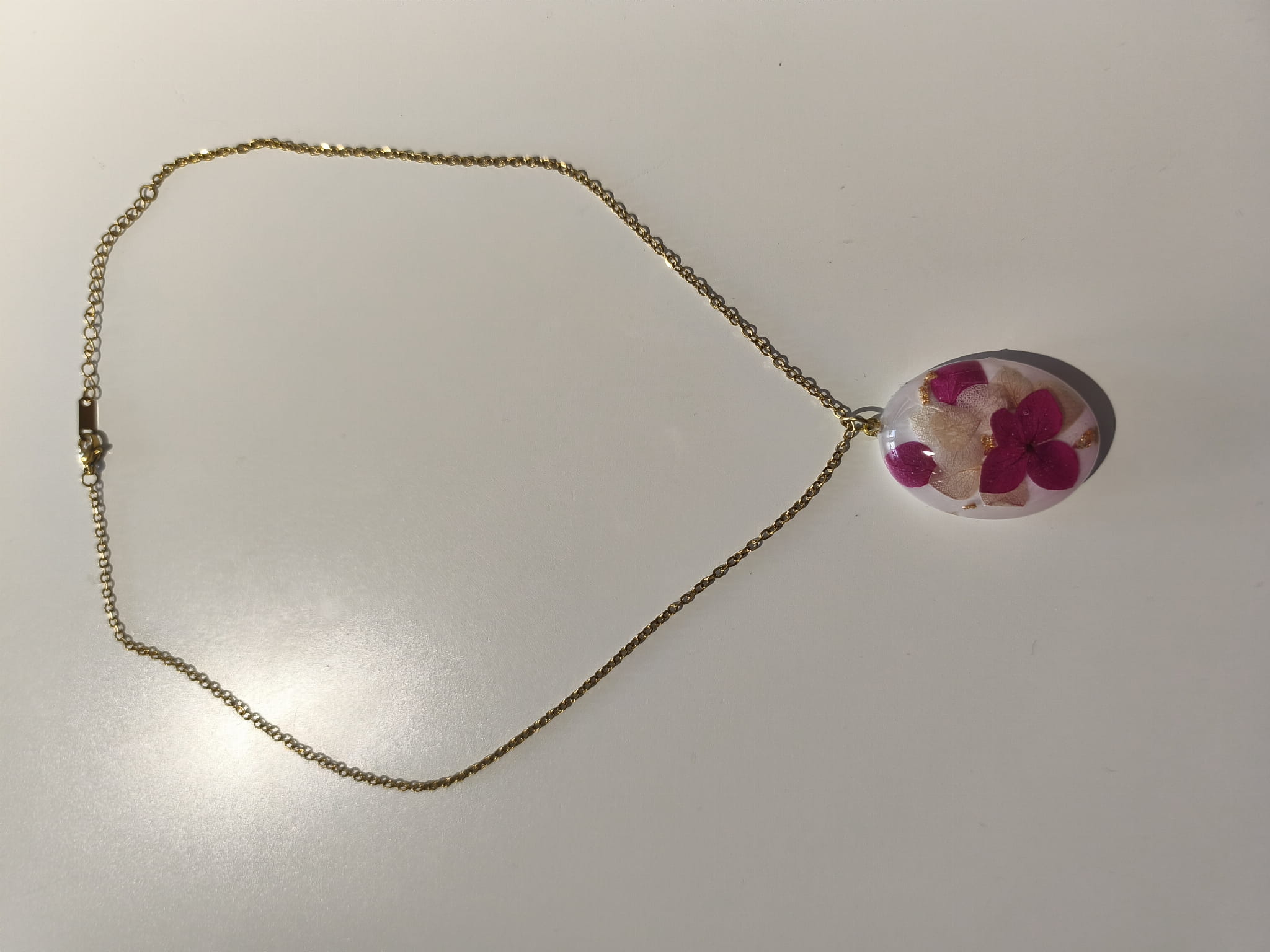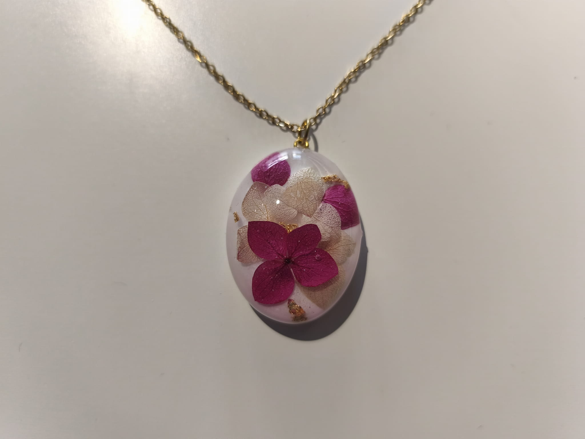 Zawieszka z białej żywicy z zatopionymi płatkami hortensji i subtelną złotą folią to wyjątkowy, ręcznie wykonany dodatek o eleganckim, romantycznym charakterze. Delikatna biel żywicy podkreśla naturalne piękno kwiatów, a złote akcenty dodają biżuterii blasku i szlachetności. Każdy egzemplarz jest niepowtarzalny – układ płatków i folii tworzy jedyną w swoim rodzaju kompozycję. Idealna jako prezent dla miłośniczek natury i minimalistycznej elegancji.