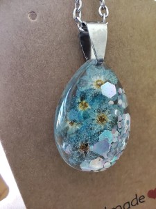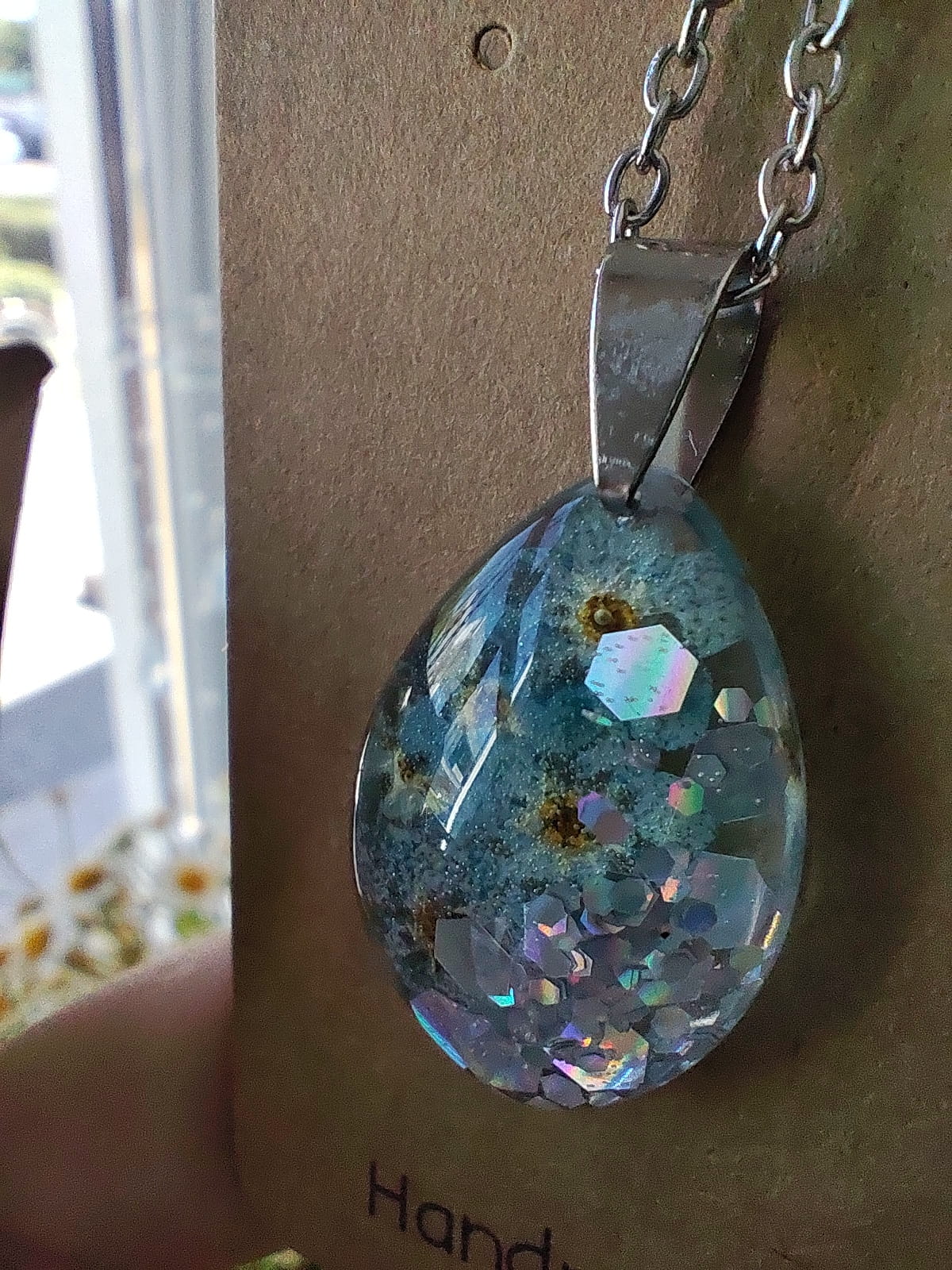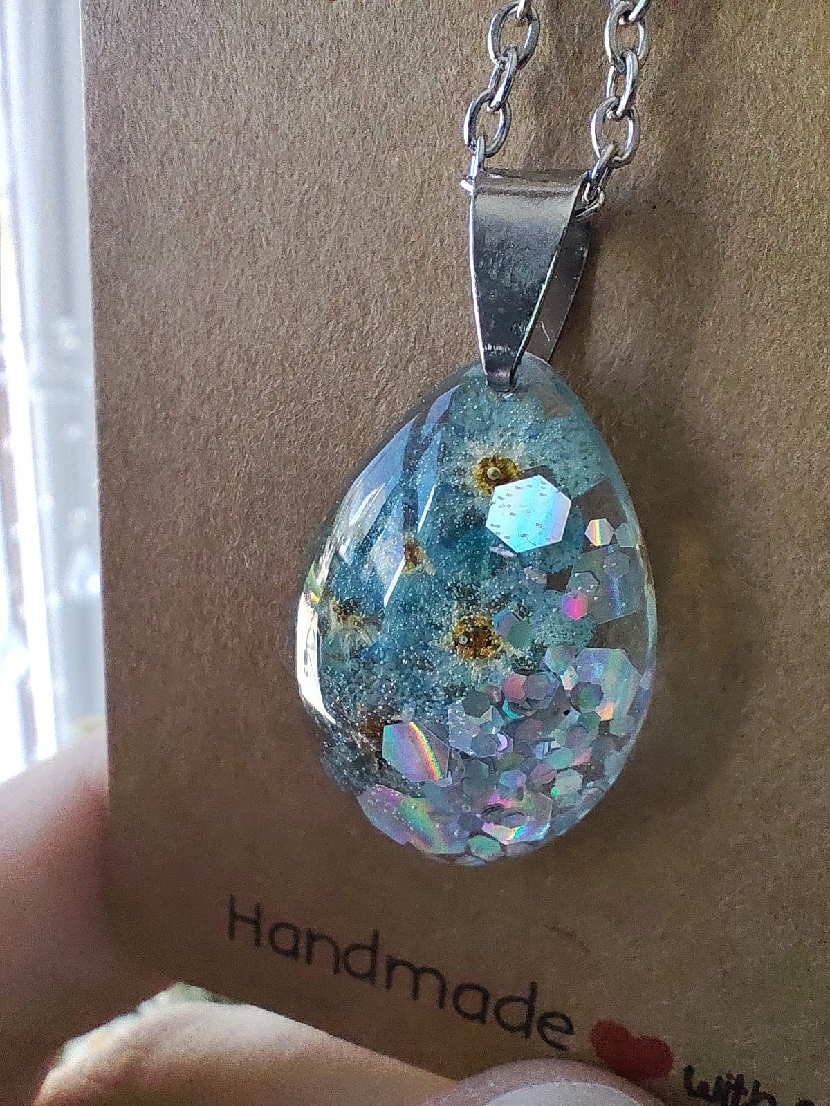 Zawieszka z przezroczystej żywicy z niezapominajkami oraz srebrną folią